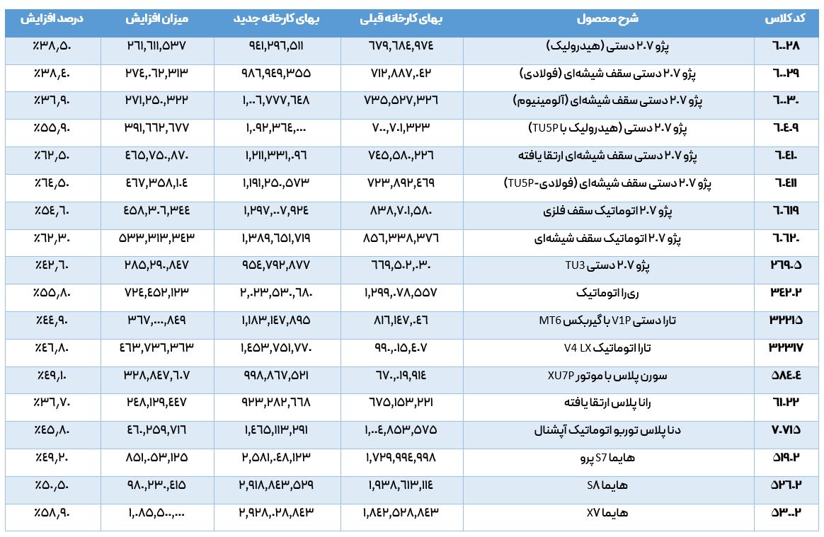 نکته کلیدی: قیمتهای مندرج در این جدول، بهای خالص کارخانه هستند و هزینههای جانبی مانند مالیات بر ارزش افزوده، شمارهگذاری، بیمه شخص ثالث و عوارض (که حدود ۱۳ تا ۱۶ درصد به مبلغ اضافه میکنند) برای آنها محاسبه نشده است.