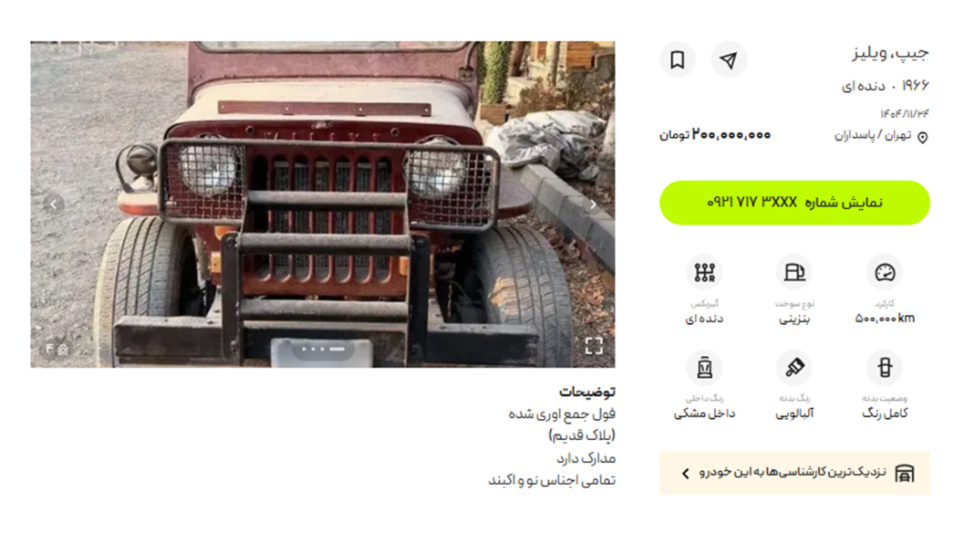 با قیمت اعلامی ۲۰۰ میلیون تومان، این جیپ ویلیس یکی از ارزانترین راهها برای ورود به دنیای خودروهای کلاسیک و کلکسیونی است. این خودرو دیگر برای شخم زدن تپههای گلی نیست؛ این ویلیس مخصوص کسی است که دوست دارد عصر جمعه، سقف برزنتی را کنار بزند، عینک دودیاش را بگذارد و با صدای نوستالژیک موتور، در خیابانها خاطرهبازی کند.