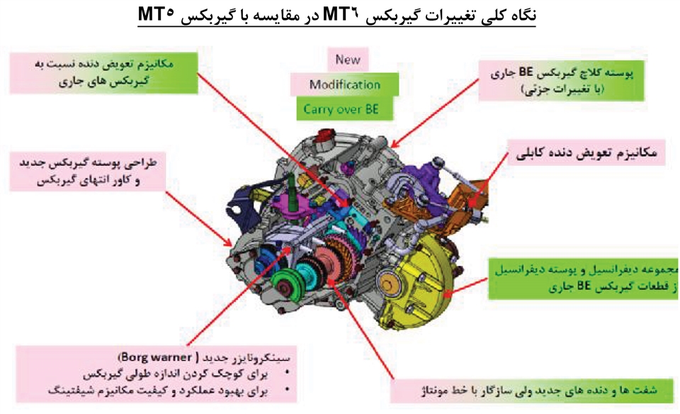 گیربکس 6 دنده MT6 ایران خودرو، از مکانیزم تعویض دنده کابلی و مکانیزم بیاژ آمونت (میزان صدا) بهره میبرد که با هدف کاهش نویز انتقالی به کابین خودرو و لرزش دسته دنده و کاهش احتمال خروج دنده به کار گرفته شده است.