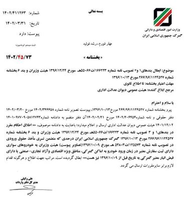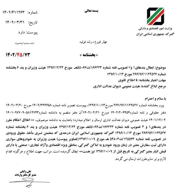 در همین راستا، بخشنامهای از دفتر واردات گمرک منتشر شد که مطابق آن ممنوعیت واردات خودروهای بالاتر از ۴۰هزار دلار به اماکن گمرکی، مناطق اقتصادی ویژه و آزاد لغو شده است. آنطور که در این بخشنامه آمده، این لغو ممنوعیت در پی مکاتبات دیوان عدالت اداری بوده است. البته تاریخ تصویب این بخشنامه ۳۰ خردادماه بوده اما روز 5 تیر متن آن در برخی خبرگزاریها منتشر شد.