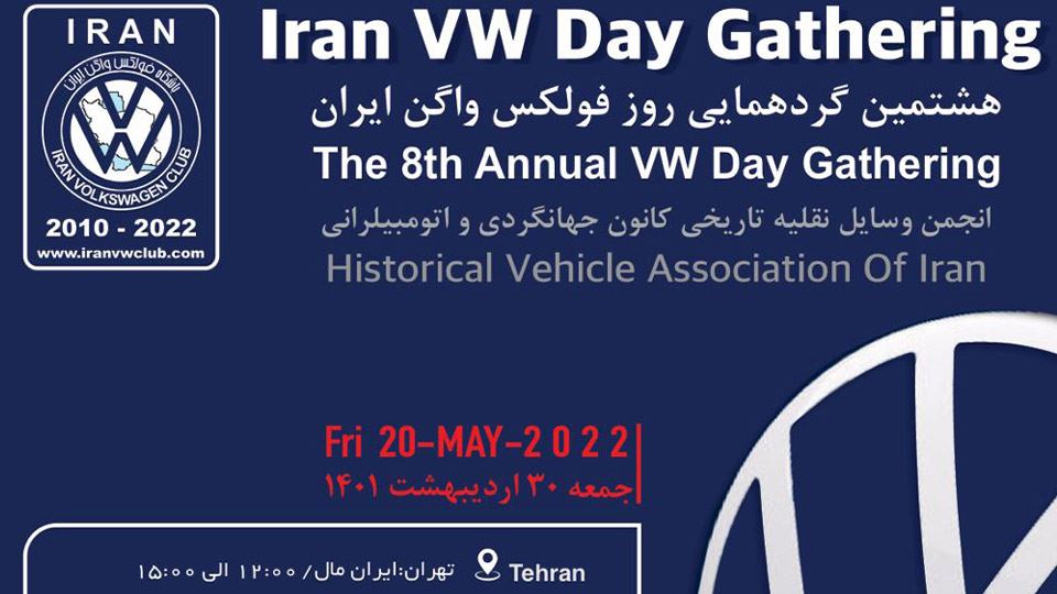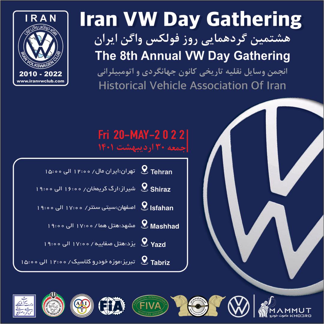 هشتمین گردهمایی «روز فولکس واگن ایران»، با حمایت انجمن وسایل نقلیه تاریخی کانون جهانگردی و اتومبلیرانی ایران، روز جمعه 30 اردیبهشتماه 1401 و به طور همزمان در شش شهر مختلف کشورمان برگزار میشود.