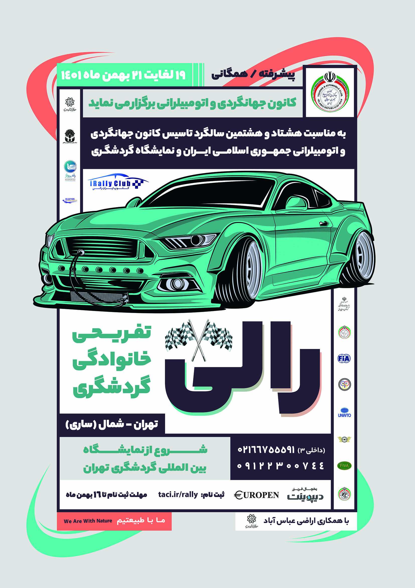 به مناسبت هشتادوهشتمین سالگرد تاسیس کانون جهانگردی و اتومبلیرانی ایران، رالی تفریحی - خانوادگی تهران شمال (به مقصد ساری) در مسیر رفت و برگشت و در دو کلاس پیشرفته و همگانی، در روزهای 19 لغایت 21 بهمنماه 1401 برگزار میشود. در همین راستا، روز سه شنبه 18 بهمن، کلاس آموزش نقشه خوانی، در محل اراضی عباس آباد، برگزار شده و نکات ایمنی و آموزشی به شرکت کنندگان ارائه میگردد.