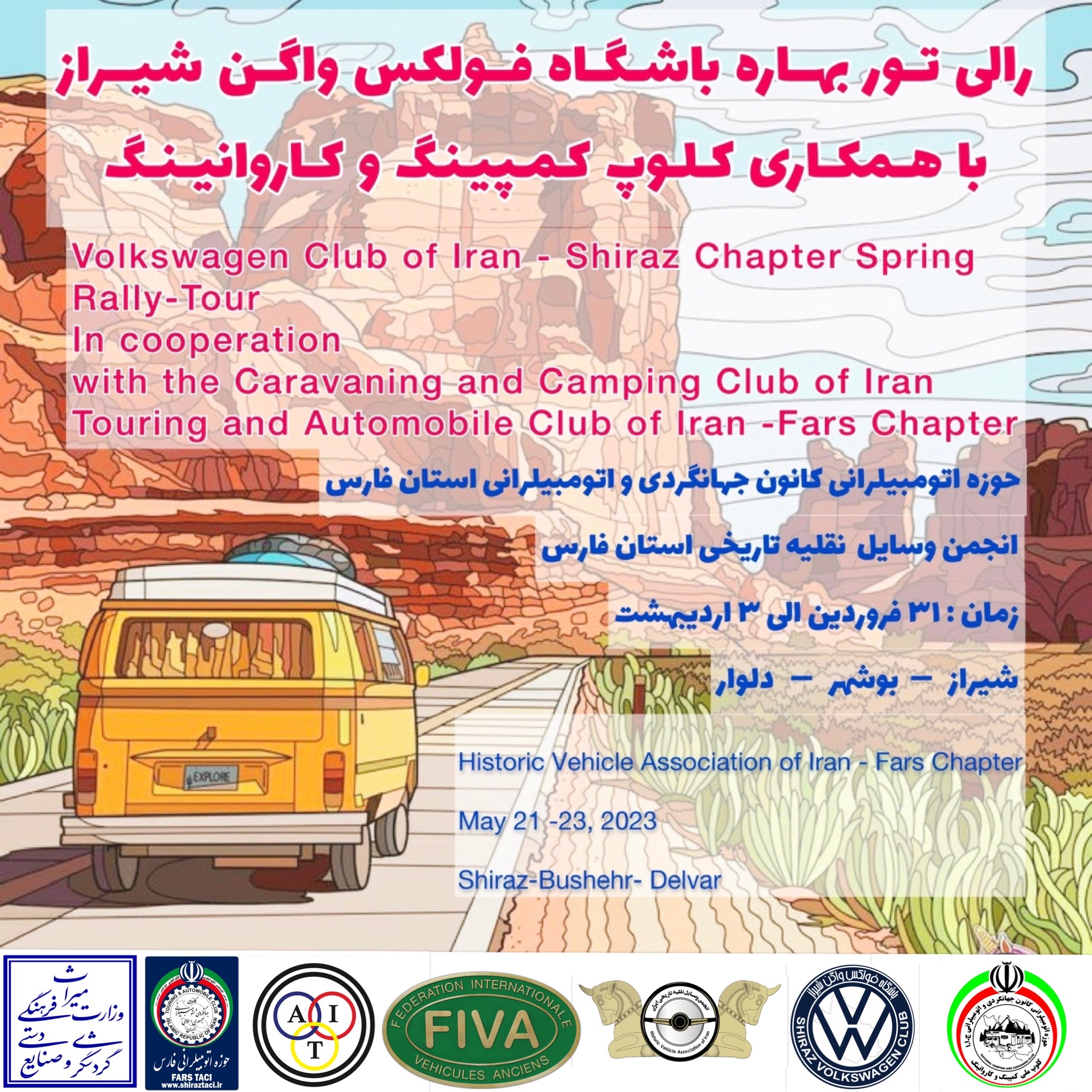 رالی تور بهاره باشگاه فولکس واگن شیراز با همکاری کلوپ کمپینگ و کاروانینگ کانون جهانگردی و اتومبیلرانی برگزار می شود. این رویداد که به همت انجمن وسایل نقلیه تاریخی و حوزه اتومبیلرانی کانون جهانگردی و اتومبیلرانی استان فارس برگزار می شود، روز پنجشنبه 31 فروردین 1402 از شهر شیراز آغاز شده و تا روز یکشنبه 3 اردیبهشت ادامه خواهد داشت.