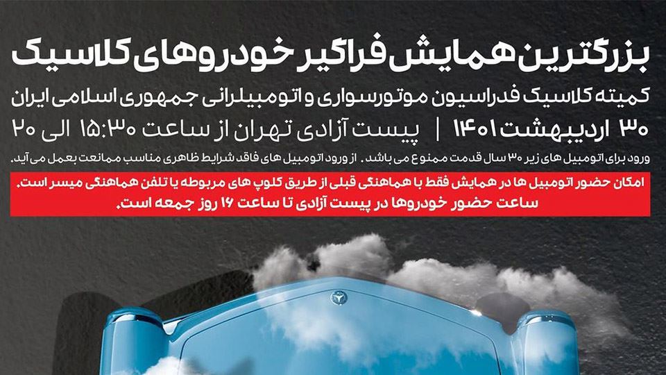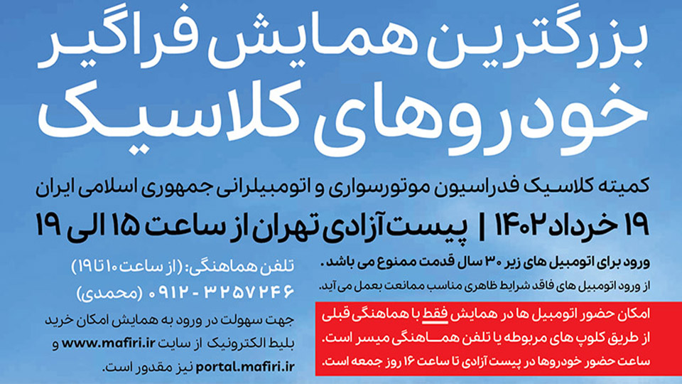 با اعلام فدراسیون موتورسواری و اتومبیلرانی، دومین همایش سالانه خودروهای کلاسیک، روز جمعه مورخ 19 خردادماه 1402 از ساعت 15 لغایت 19 در محل پیست مجموعه ورزشی آزادی تهران، برگزار میگردد.