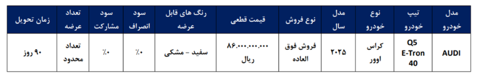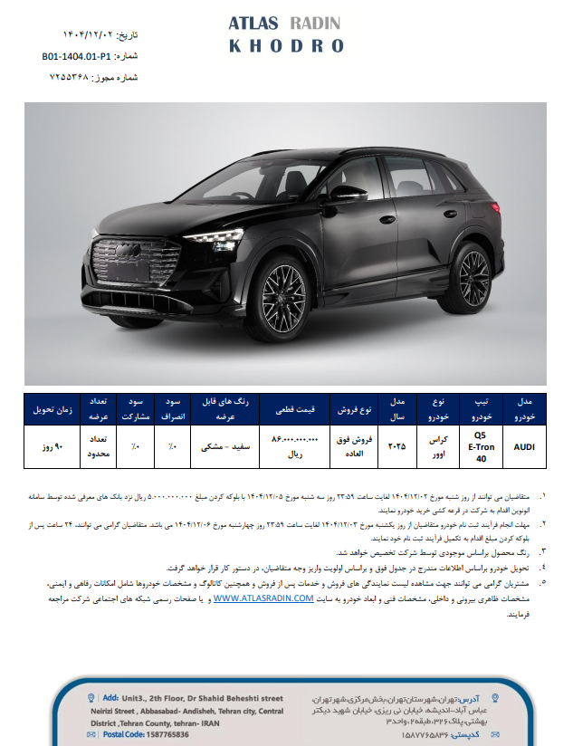 دومین مرحله فروش اطلس رادین خودرو، ویژه متقاضیان ثبت نام آئودی Q5 برقی وارداتی این شرکت، از روز شنبه مورخ 22 فروردینماه 1405 مطابق جدول زیر آغاز شده است: