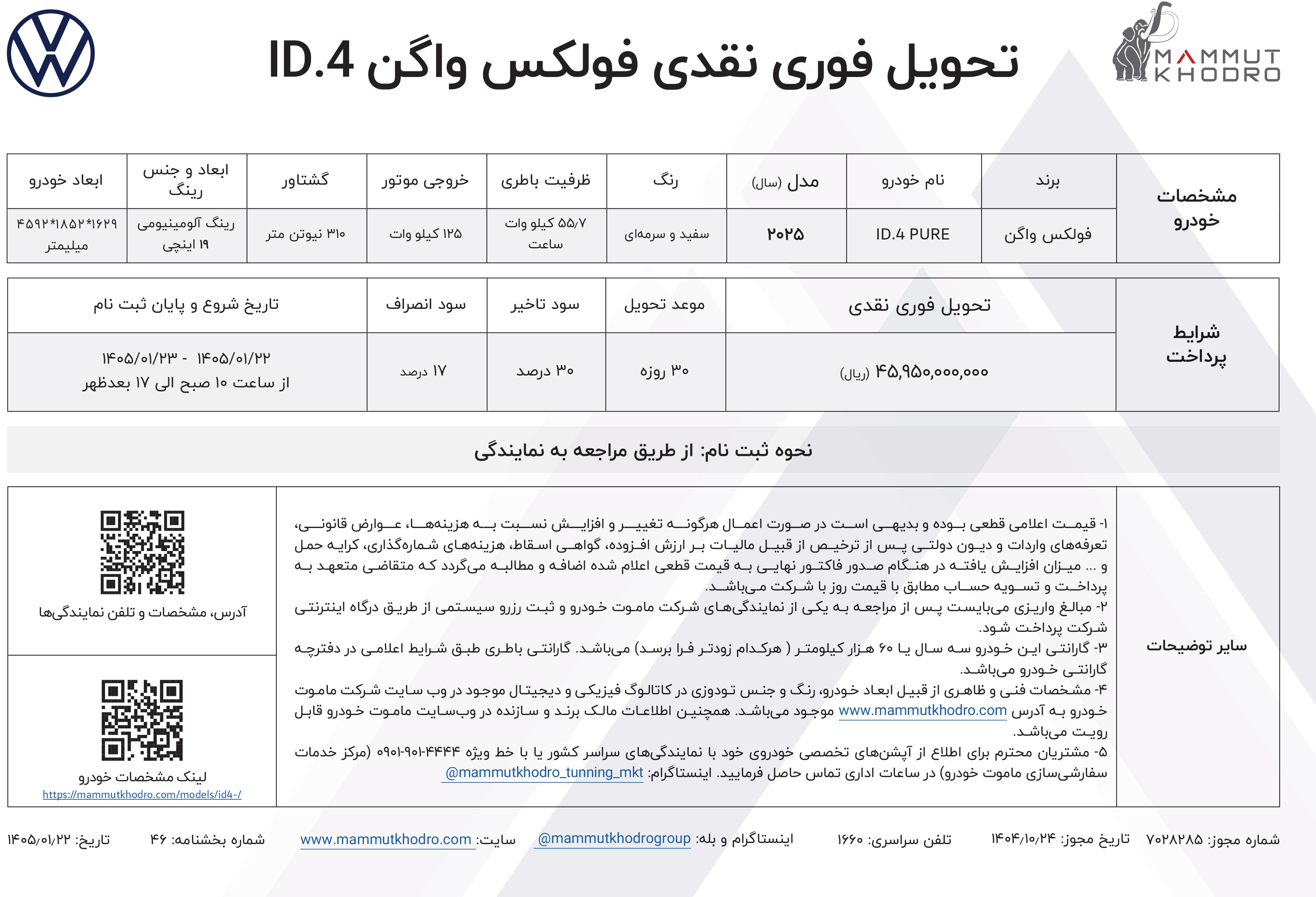 ثبت نام نقدی فولکس ID4 وارداتی: فروردین 1405