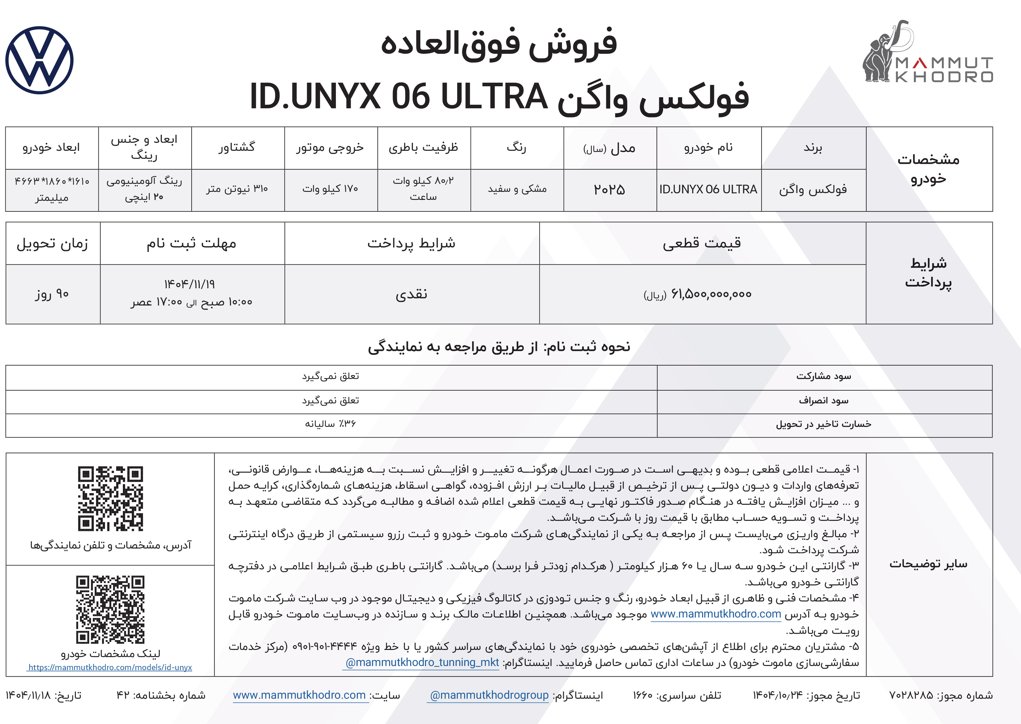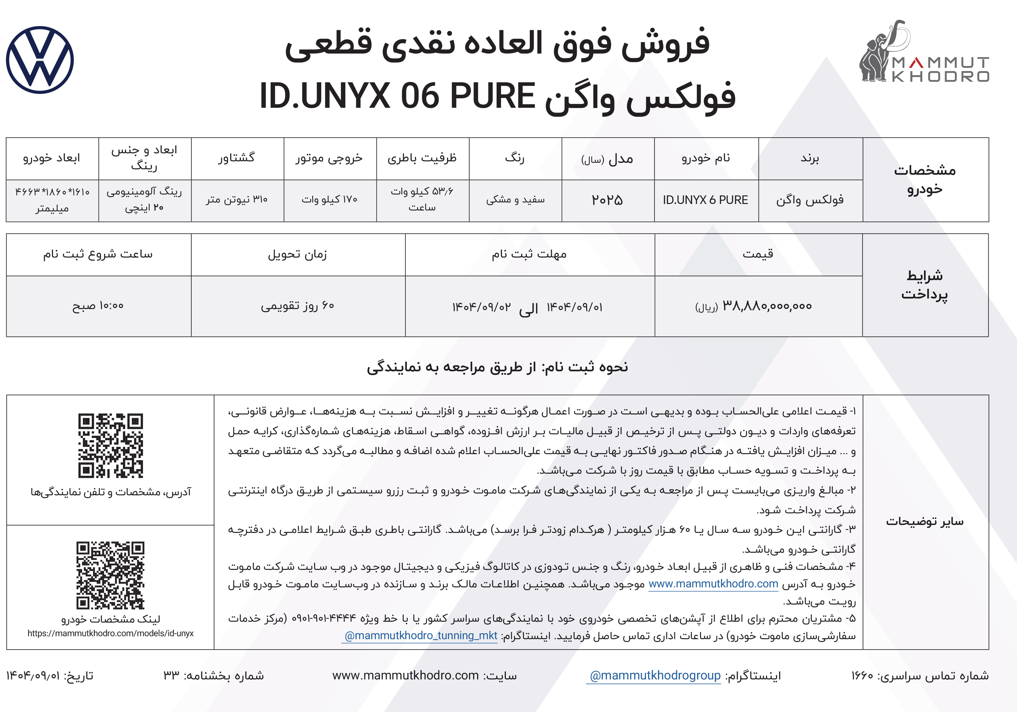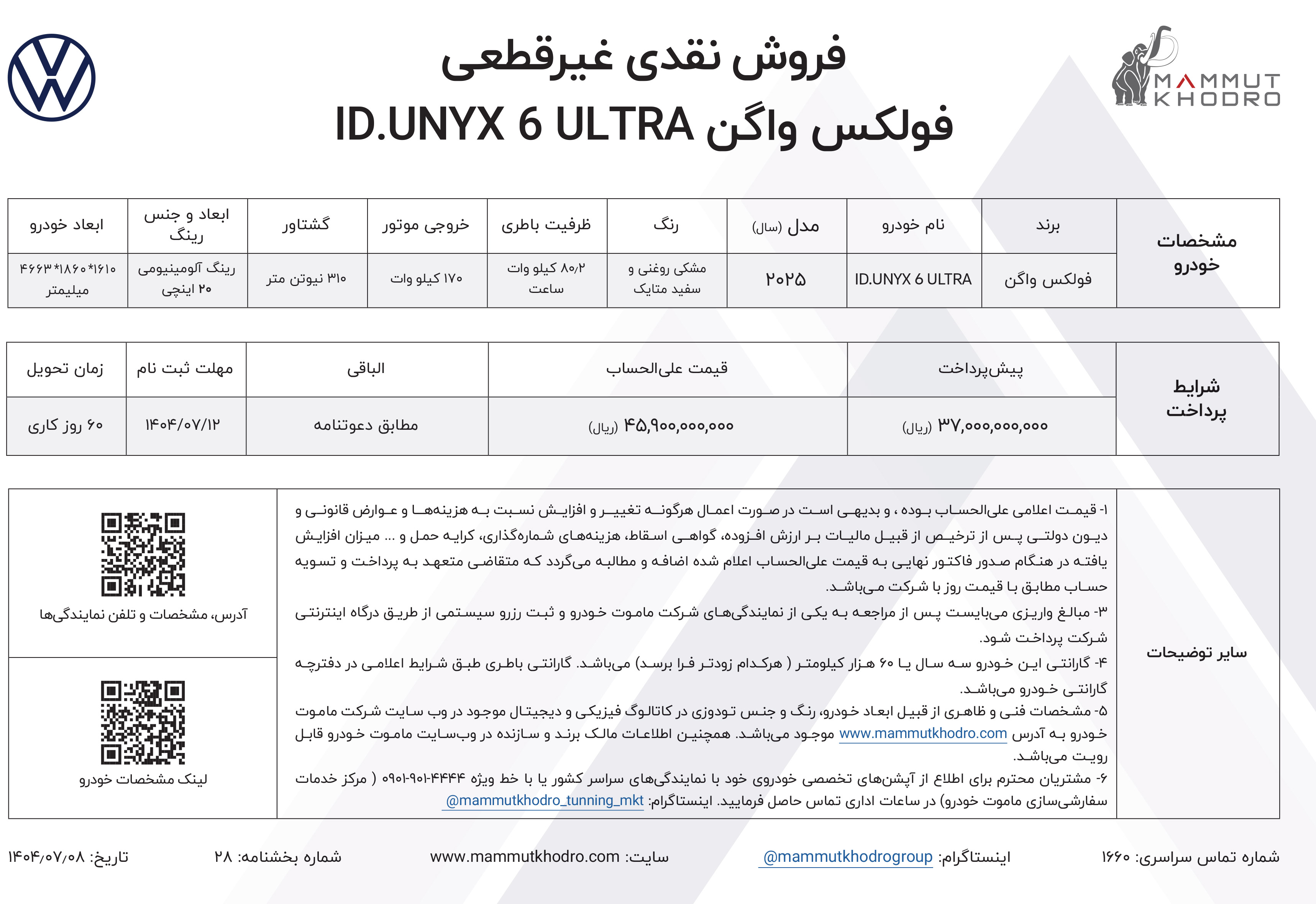 شرکت ماموت خودرو از روز سهشنبه مورخ 1404/08/27 قیمت ثبت نام فولکس واگن آی دی یونیکس را مطابق جدول زیر، اعلام کرده است:
