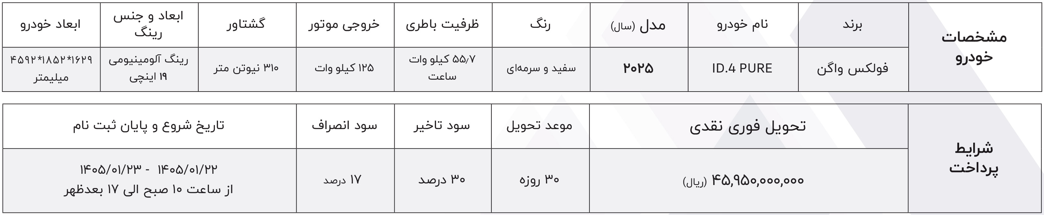 پیش فروش فولکس ID4 برقی، از روز دوشنبه مورخ 1404/02/01 آغاز شده و تا زمان تکمیل ظرفیت فروش نیز ادامه دارد. در این مرحله از ثبت نام فولکس واگن برقی، قیمت خودروها غیرقطعی است و در زمان صدور دعوتنامه به اطلاع خریداران میرسد: