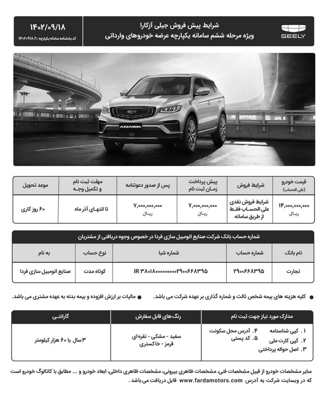 شرکت خودروسازی فردا موتور، که عرضه کننده محصولات وارداتی جیلی در ایران است، شرایط پیش فروش جیلی را برای نخستینبار، اعلام کرد. ثبت نام جیلی که از تاریخ 18 آذرماه شروع شده و تا پایان آذرماه 1402 نیز ادامه خواهد داشت، صرفا ویژه منتخبین سامانه یکپارچه خرید خودروهای وارداتی است:
