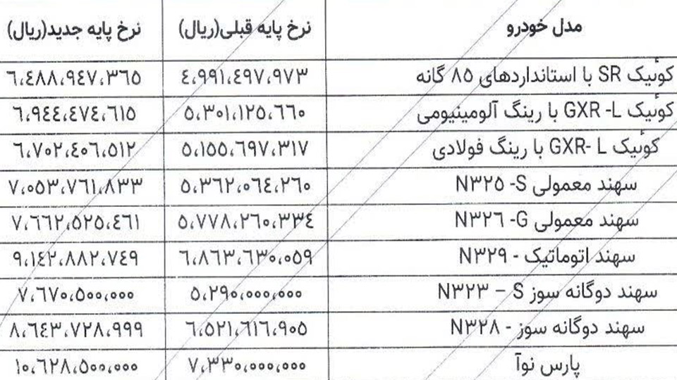 | مدل | قیمت پایه قدیم | قیمت پایه جدید | درصد افزایش |