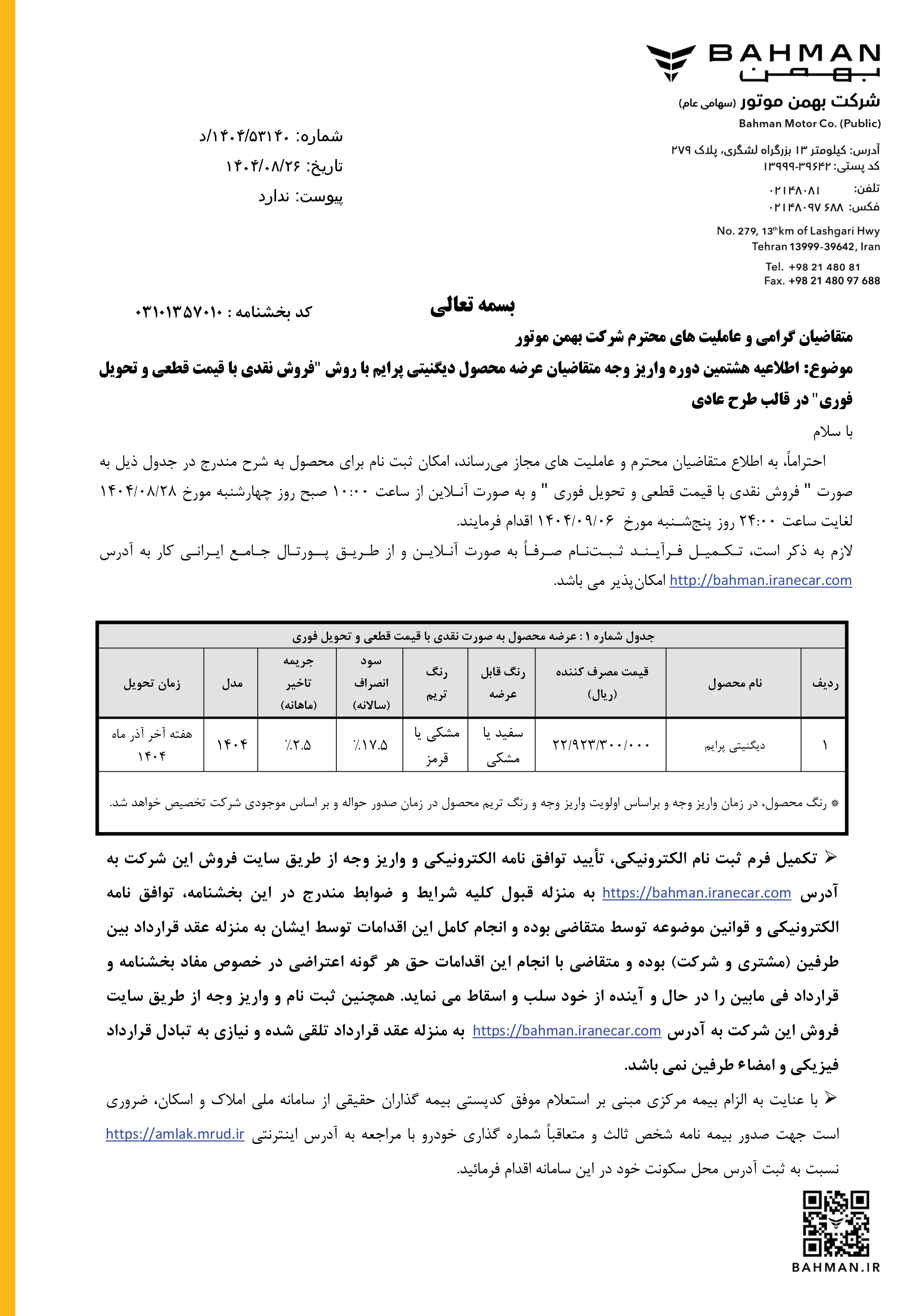 فراخوان جدید شرکت بهمن موتور ویژه متقاضیان ثبت نام دیگنیتی که در طرح فروش نقدی تیپ پرایم شرکت کردهاند، از روز چهارشنبه مورخ 1404/04/18 آغاز شده و تا روز دوشنبه مورخ 1404/04/23 یا تا زمان تکمیل ظرفیت فروش، ادامه خواهد داشت:
