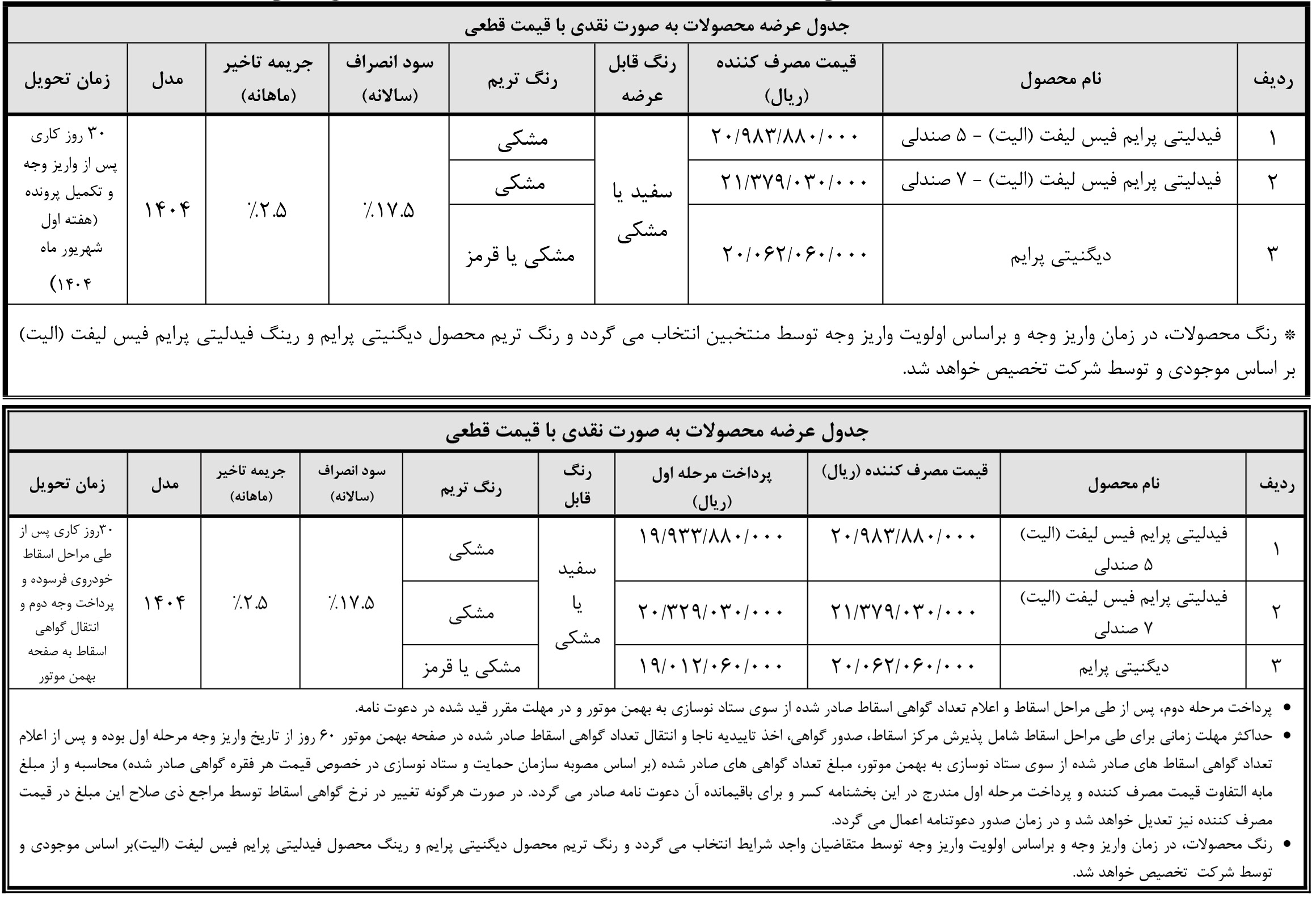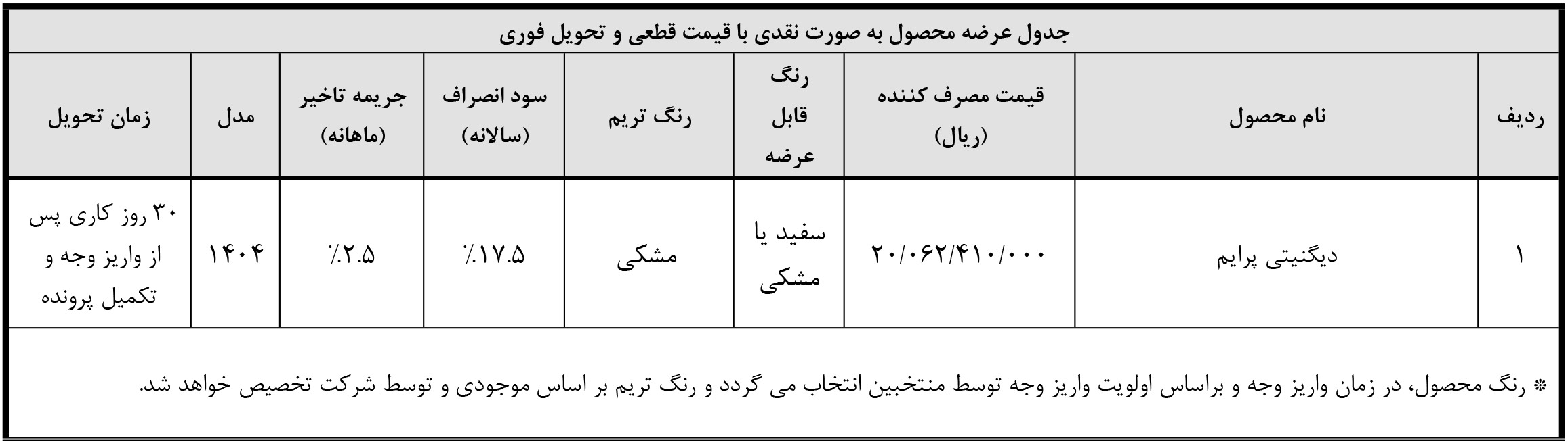 شرایط فروش دیگنیتی پرایم ویژه متقاضیان طرح فروش نقدی، طرح فروش اعتباری و همچنین طرح پیش فروش، از روز شنبه مورخ 5 مهرماه آغاز شده و تا روز پنجشنبه مورخ 10 مهرماه 1404 یا تا زمان تکمیل ظرفیت فروش نیز ادامه خواهد داشت: