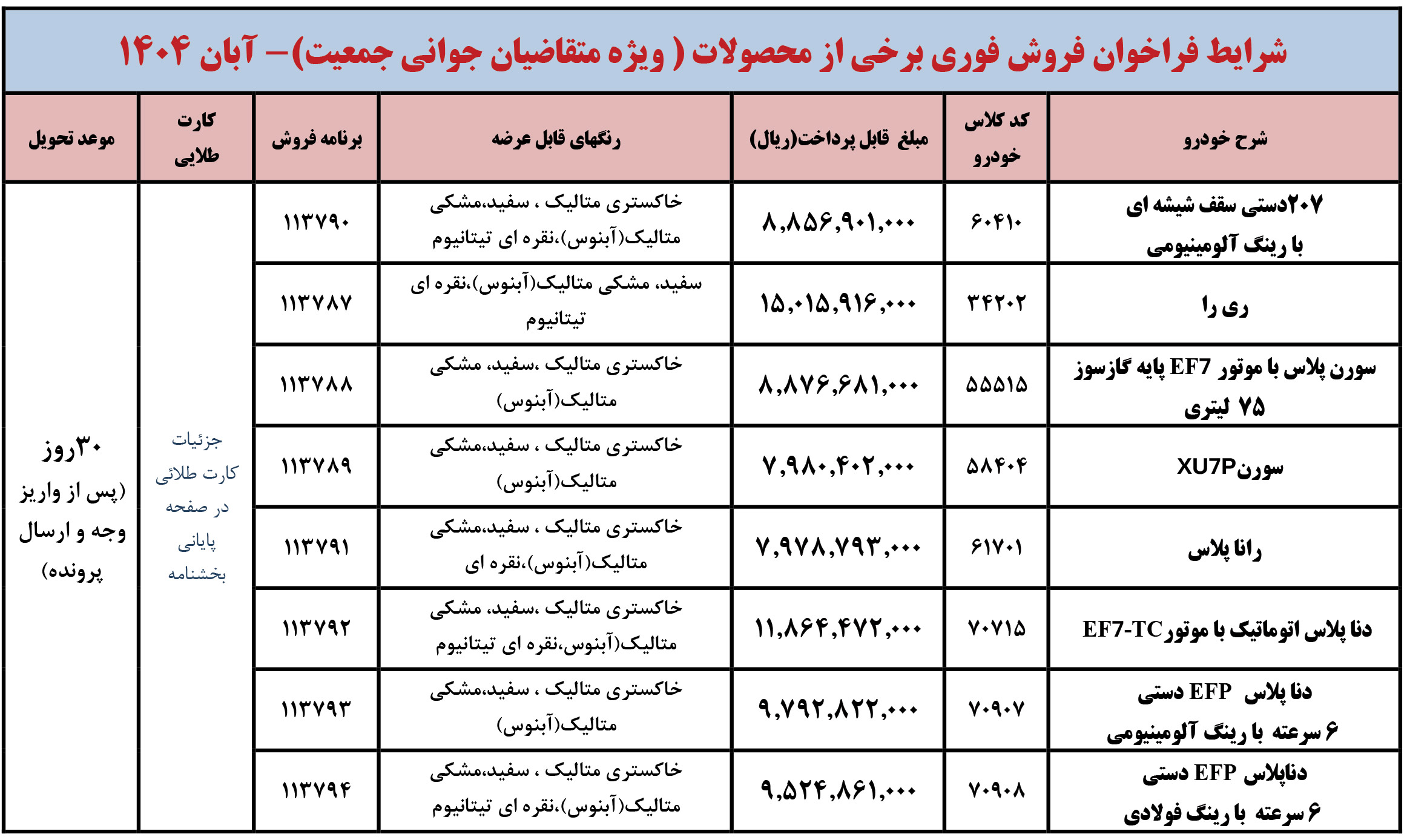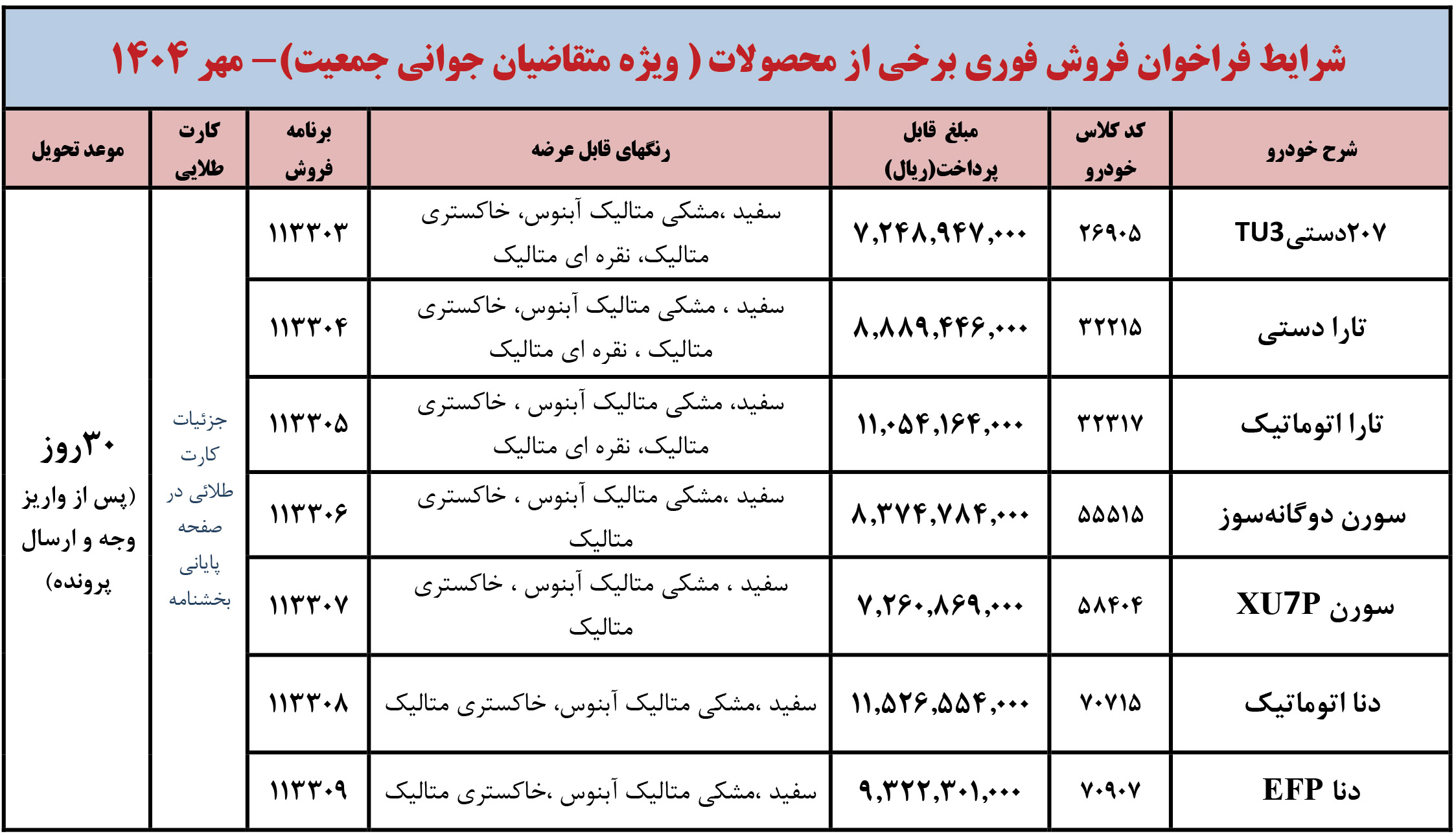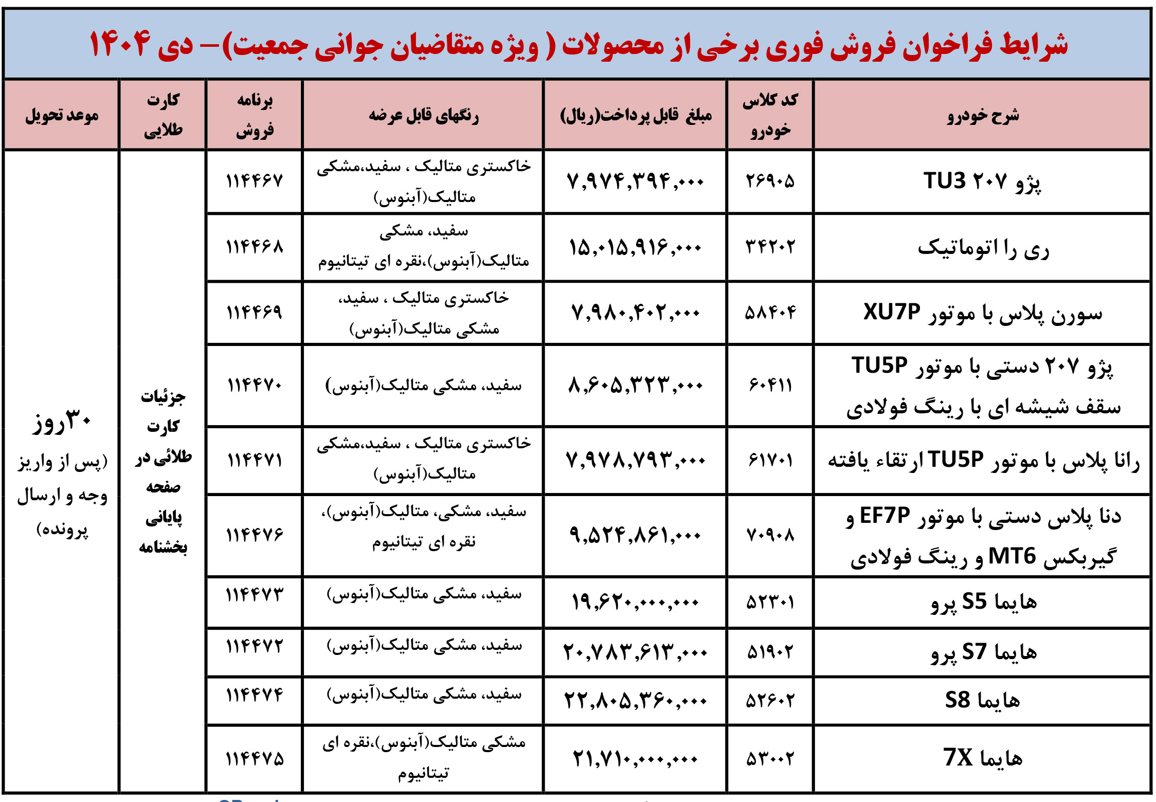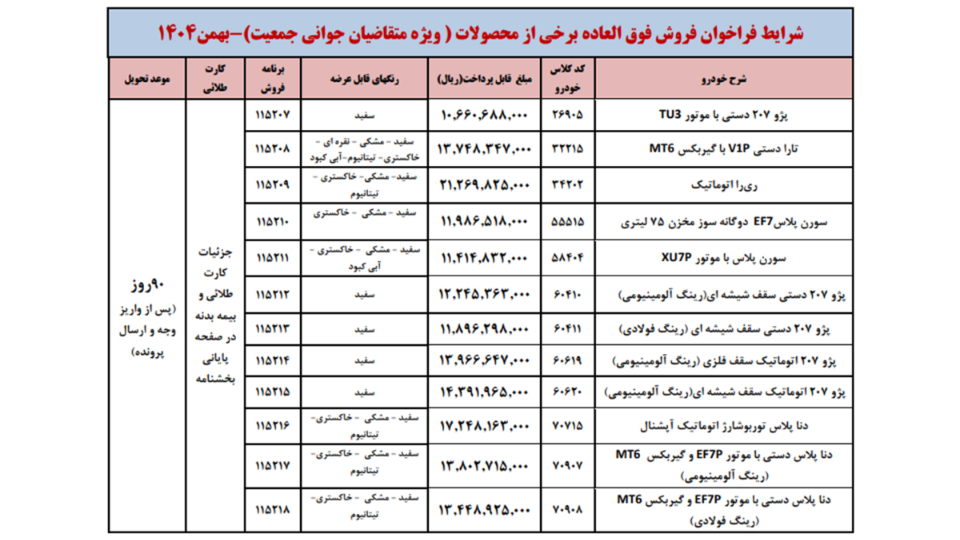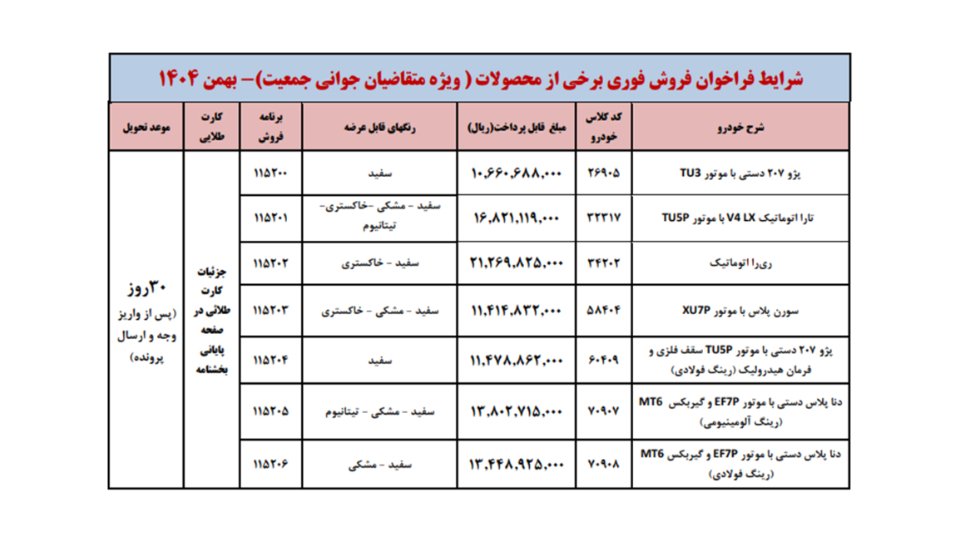 شرايط فراخوان فروش فوری (موعد تحويل حداكثر 3 ماهه) محصولات ايران خودرو - ويژه متقاضيان قانون حمایت از خانواده و جوانی جمعیت - مطابق جدول فوق از روز شنبه مورخ 1404/12/02 شروع و تا پايان روز شنبه 1404/12/09 ادامه خواهد داشت.