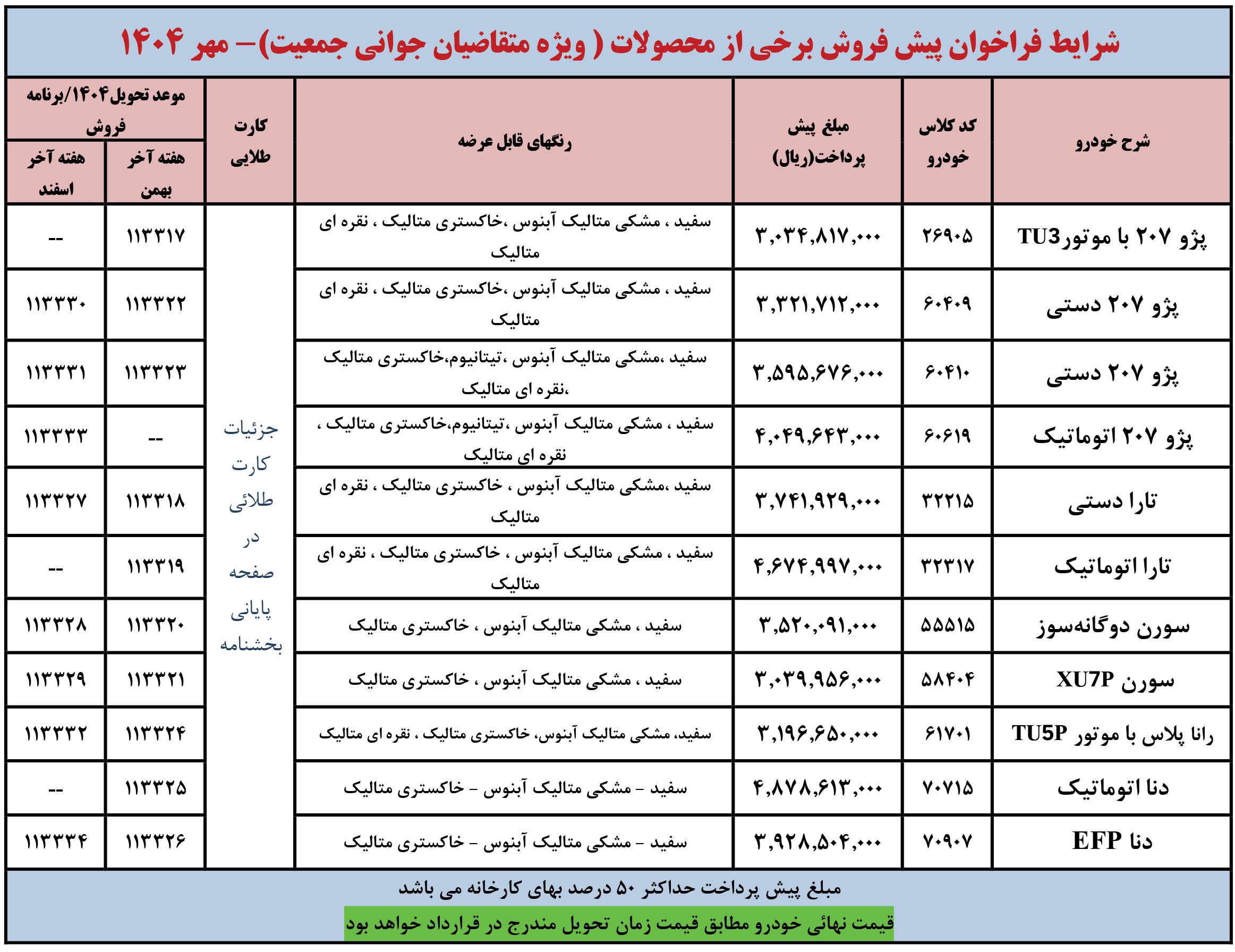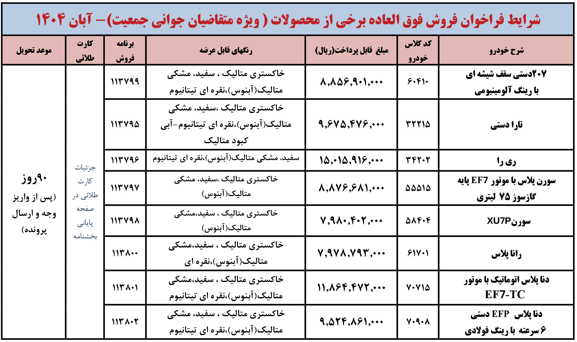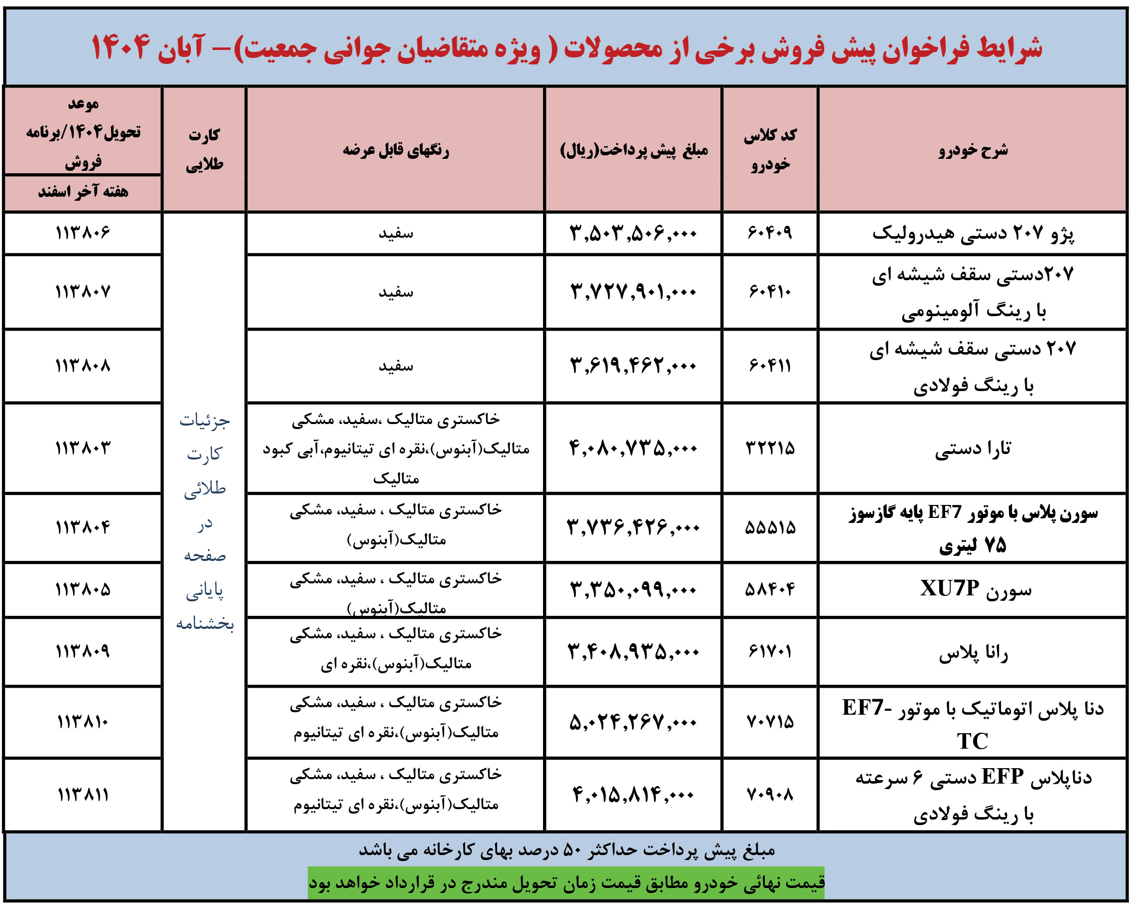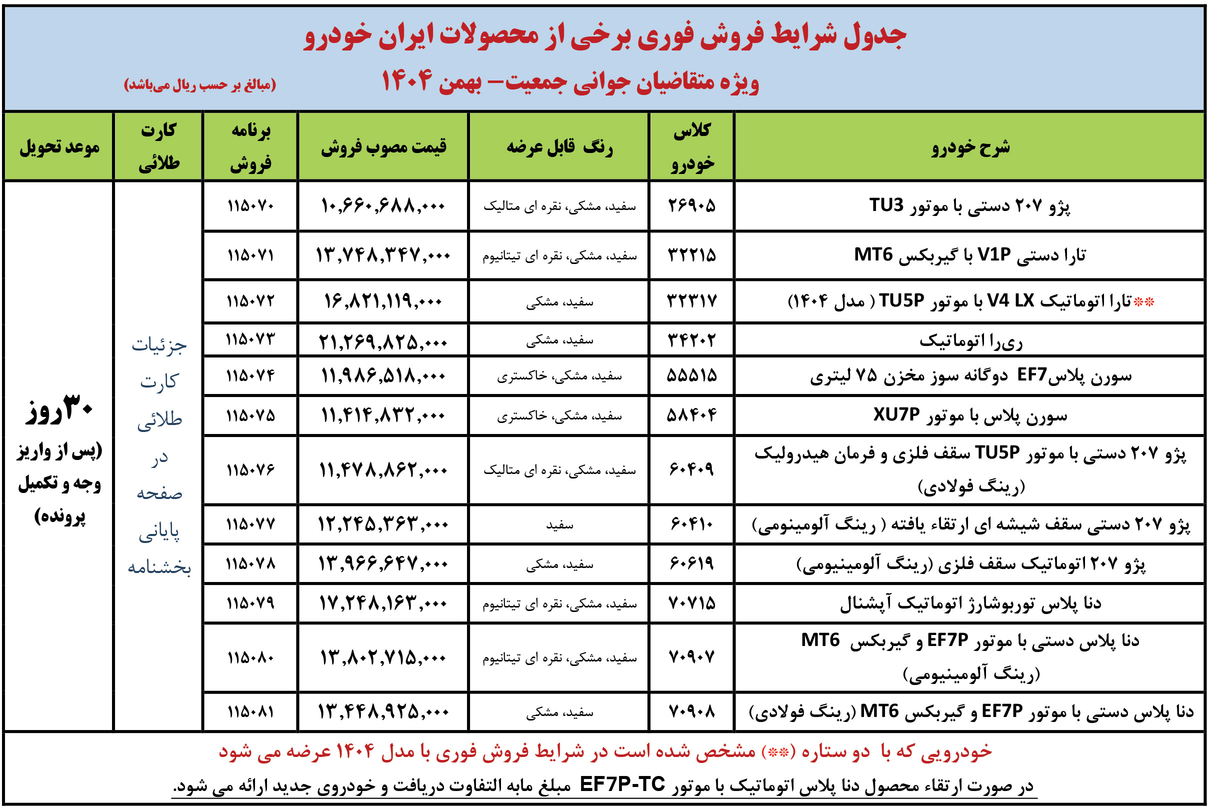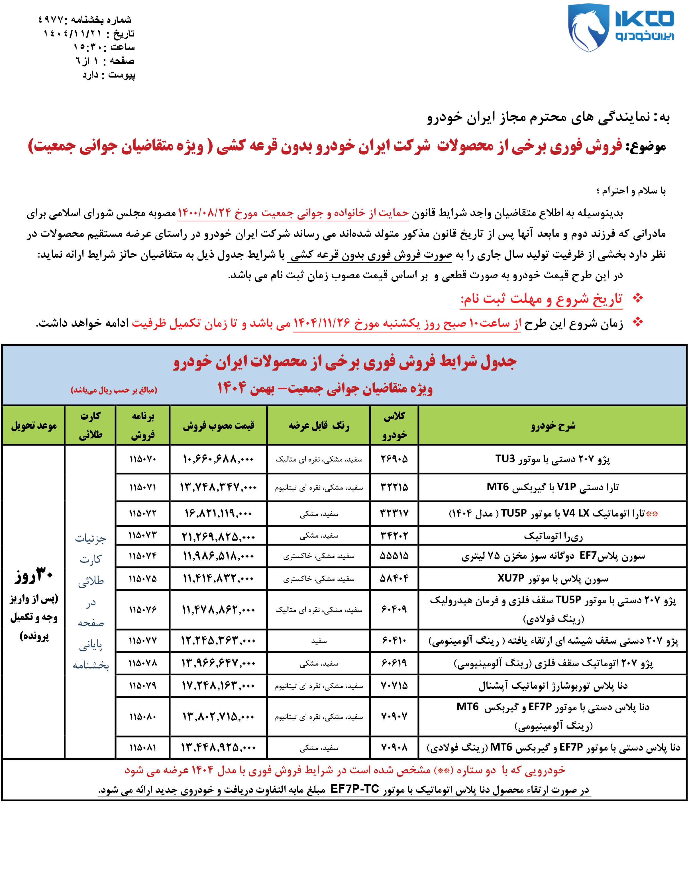 شرايط فراخوان فروش فوری (موعد تحويل حداكثر 3 ماهه) محصولات ايران خودرو - ويژه متقاضيان قانون حمایت از خانواده و جوانی جمعیت - مطابق جدول فوق از روز شنبه مورخ 1404/12/02 شروع و تا پايان روز شنبه 1404/12/09 ادامه خواهد داشت.