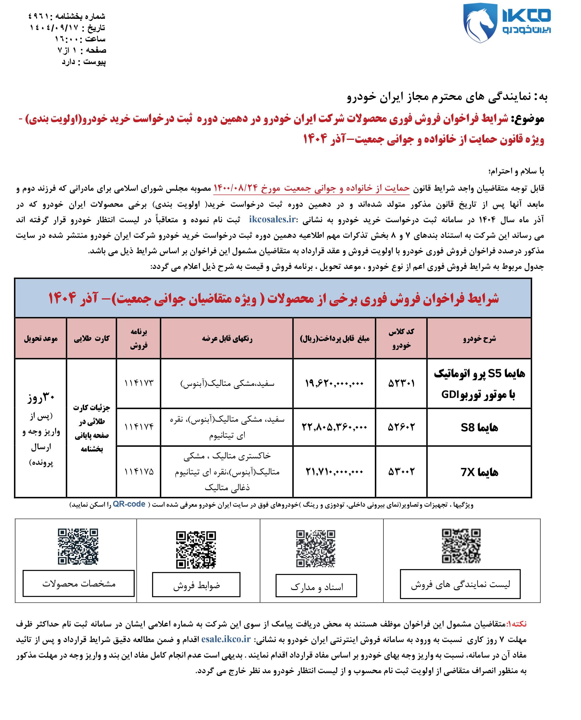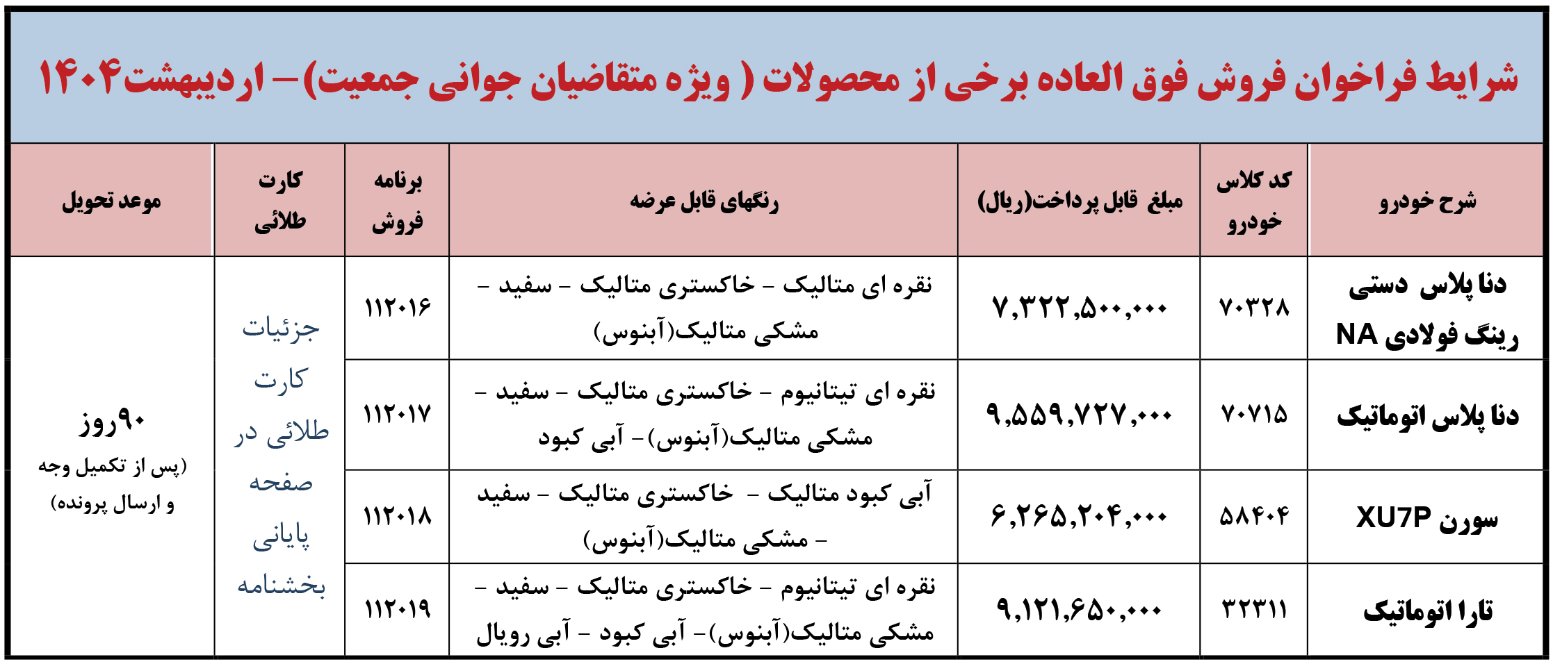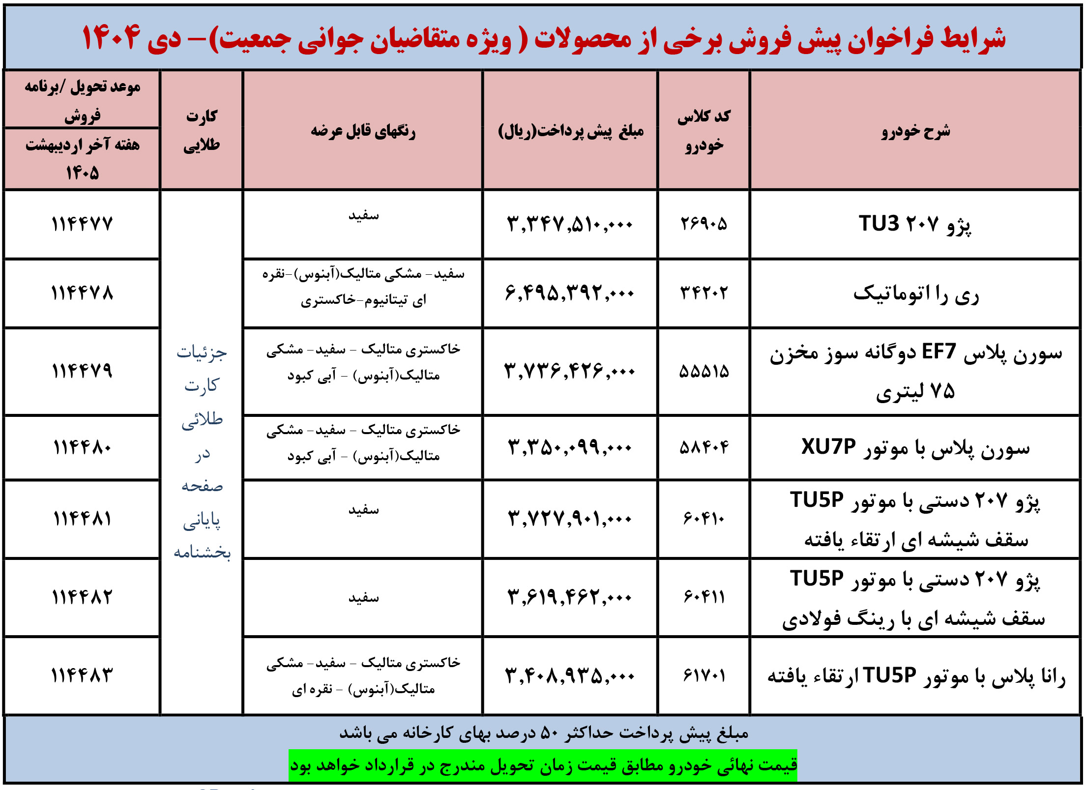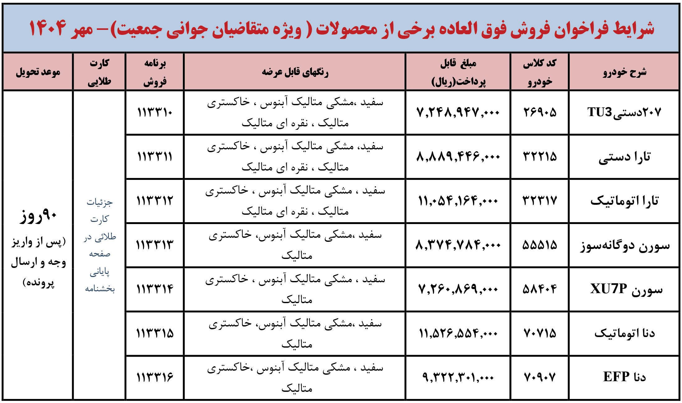 شرايط فراخوان فروش فوری (موعد تحويل حداكثر 3 ماهه) محصولات ايران خودرو - ويژه متقاضيان قانون حمایت از خانواده و جوانی جمعیت - مطابق جدول فوق از روز شنبه مورخ 1404/12/02 شروع و تا پايان روز شنبه 1404/12/09 ادامه خواهد داشت.