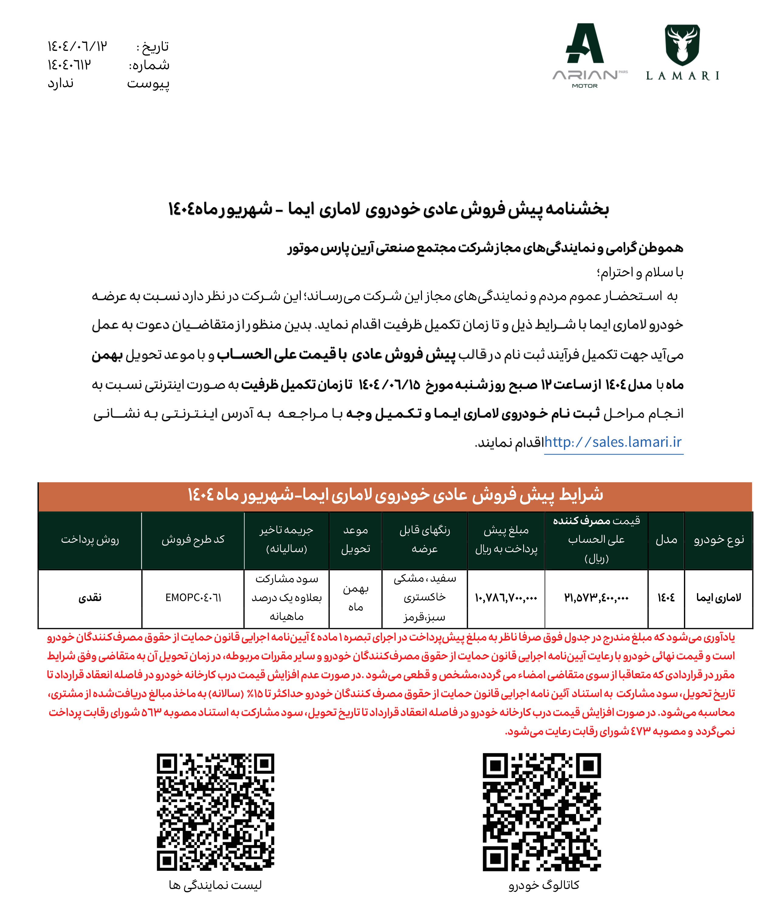 شرایط پیش فروش لاماری، ویژه نمایندگیهای منتخب آرین پارس موتور، اعلام شده است. برهمین اساس، پیش فروش ایما هیبریدی از طریق سامانه sales.lamari.ir از روز سهشنبه مورخ 1404/01/26 آغاز شده و تا پایان روز شنبه مورخ 1404/01/30 نیز ادامه خواهد داشت: