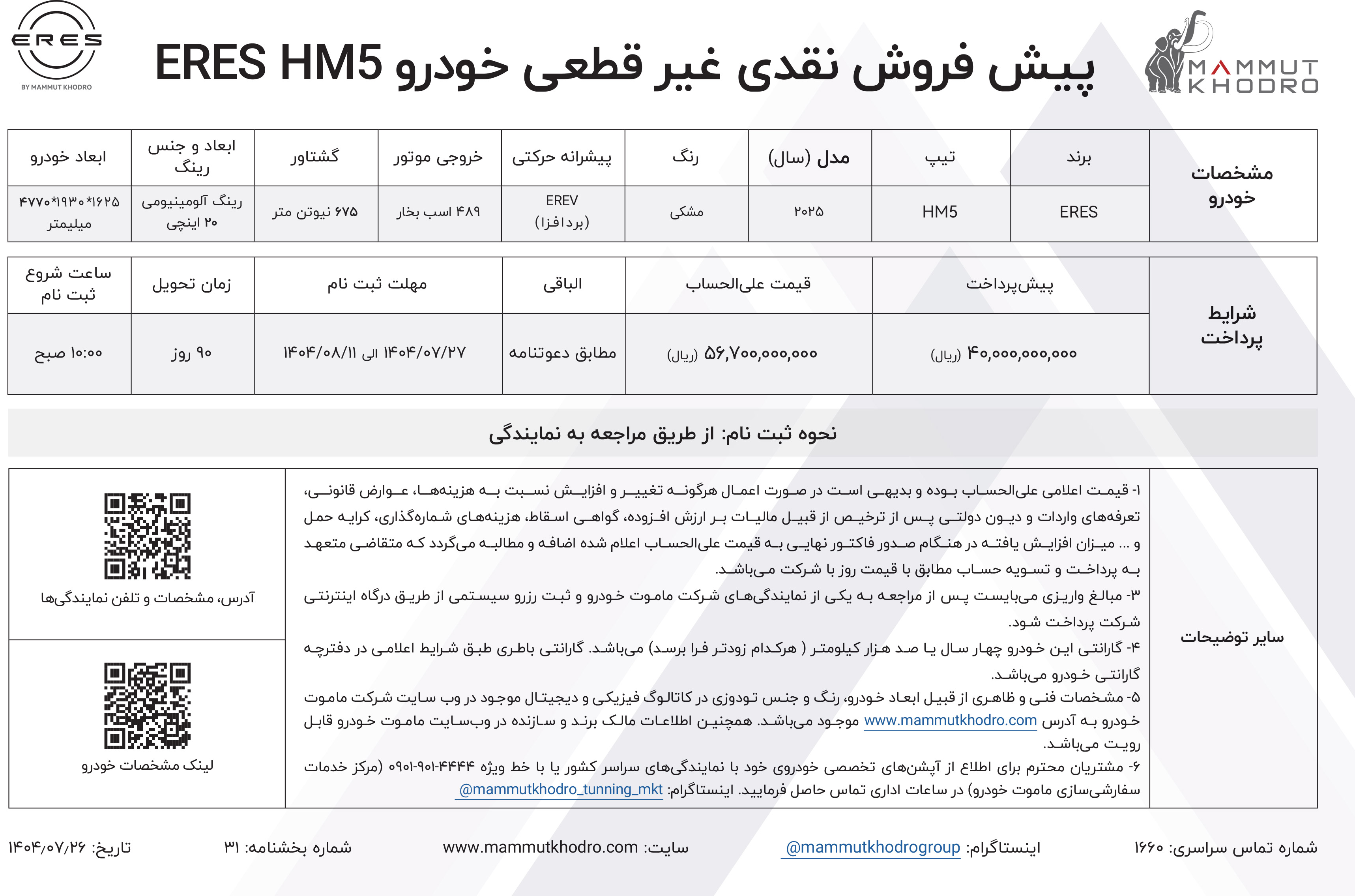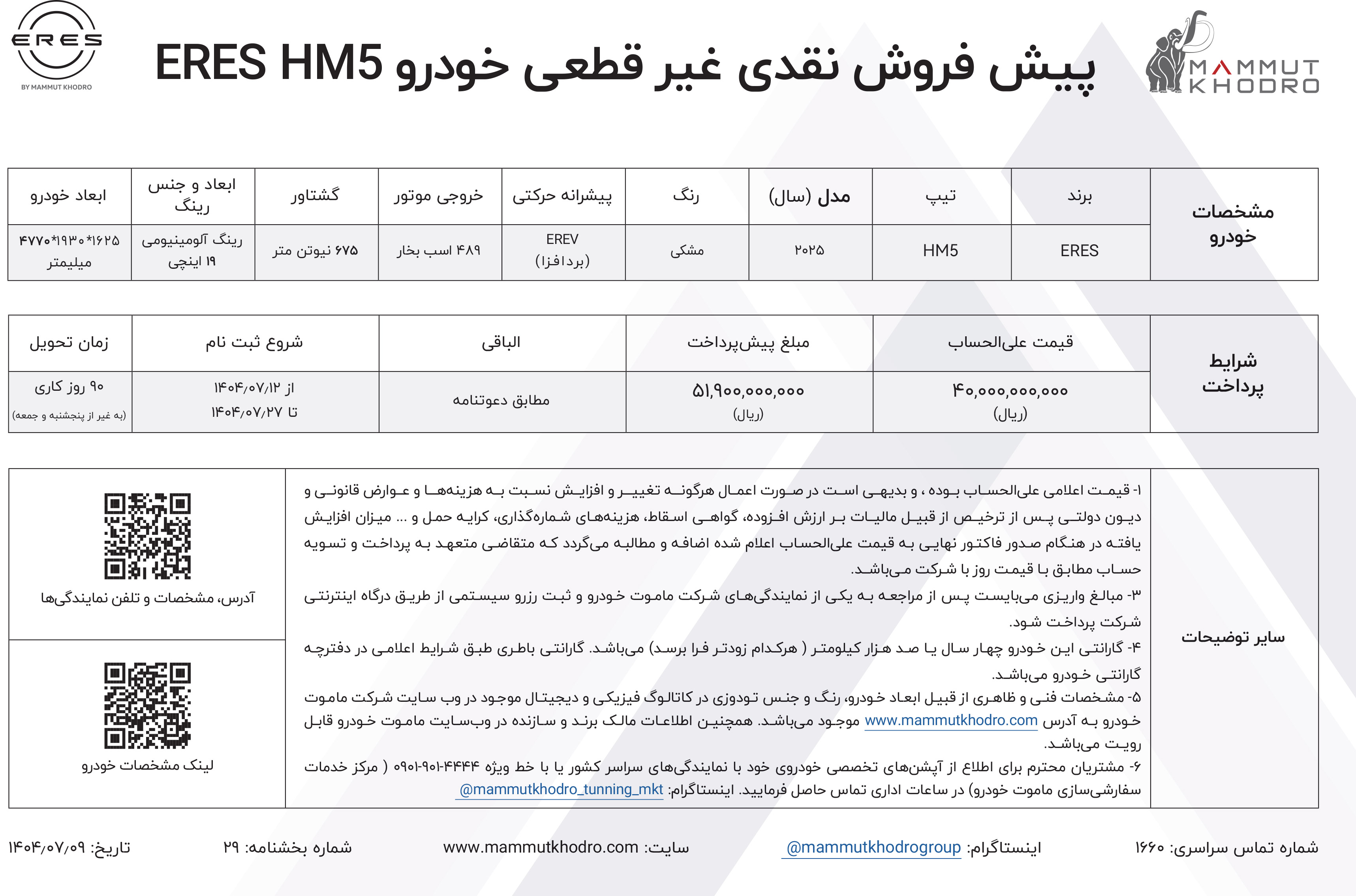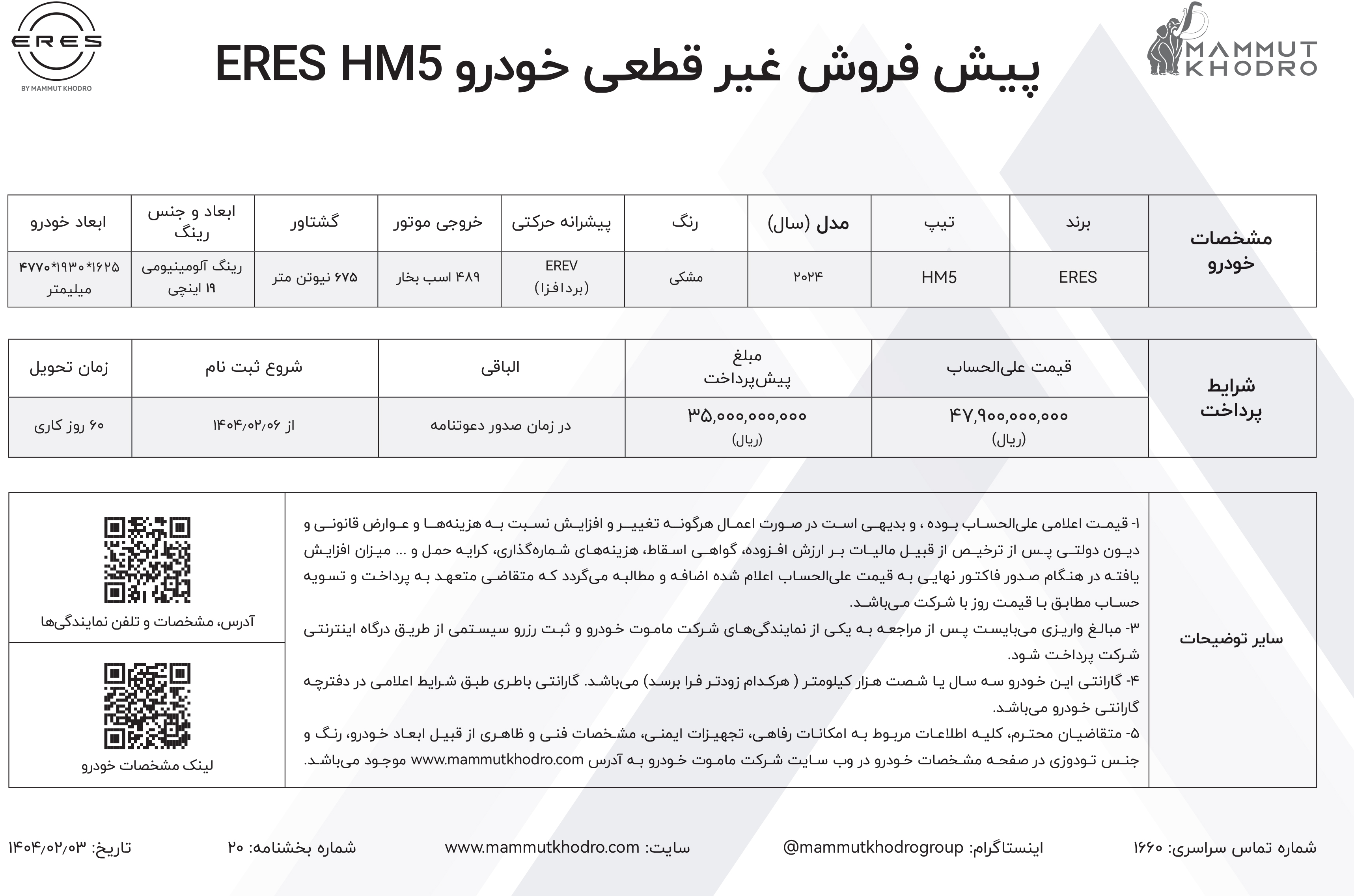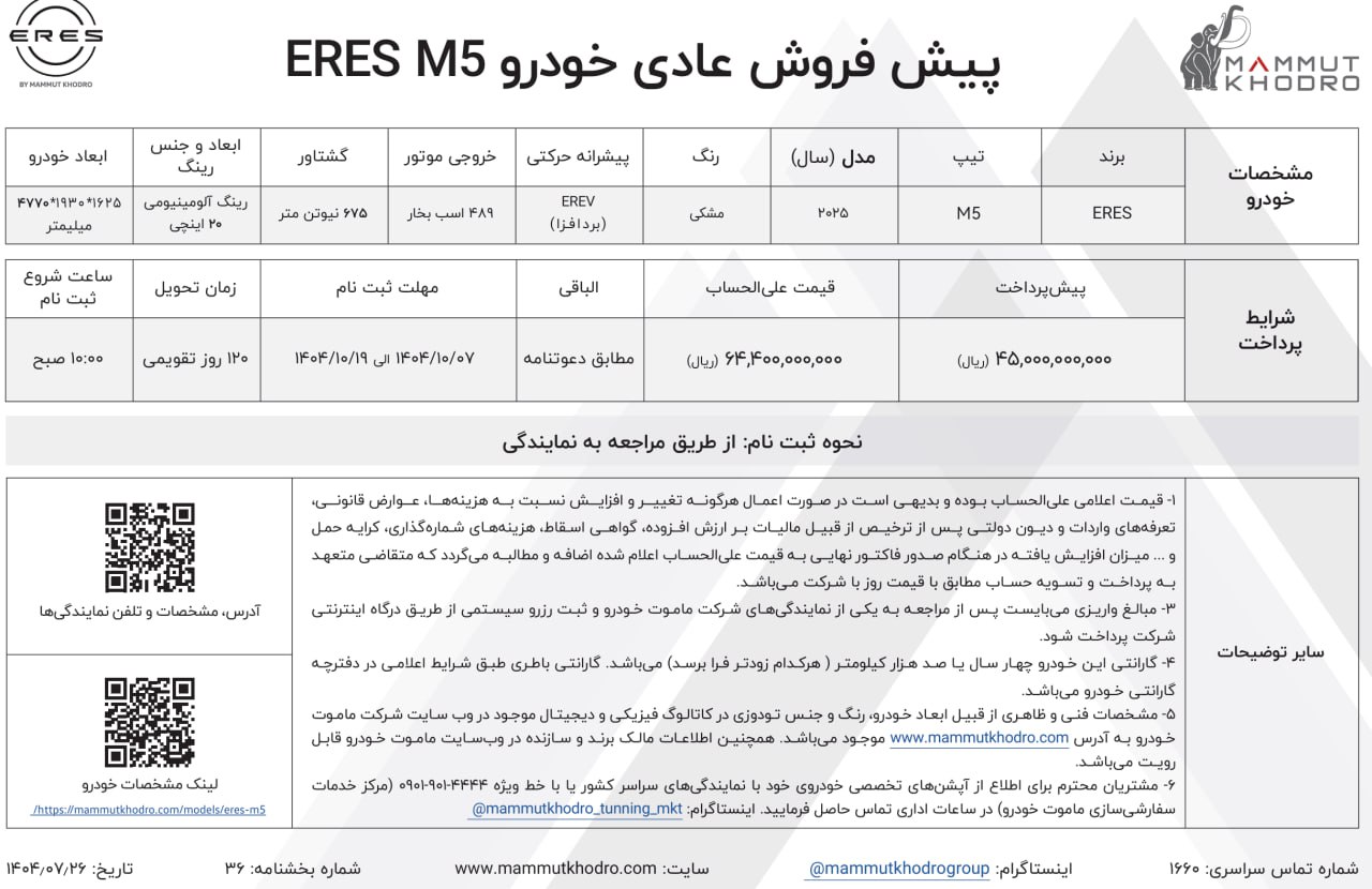 براساس بخشنامه پیش فروش ایرس ماموت خودرو، قیمت محصولات غیرقطعی و همزمان با موعد تحویل، به اطلاع خریداران خواهد رسید. جزییات بیشتر را از لینک زیر دریافت کنید:
