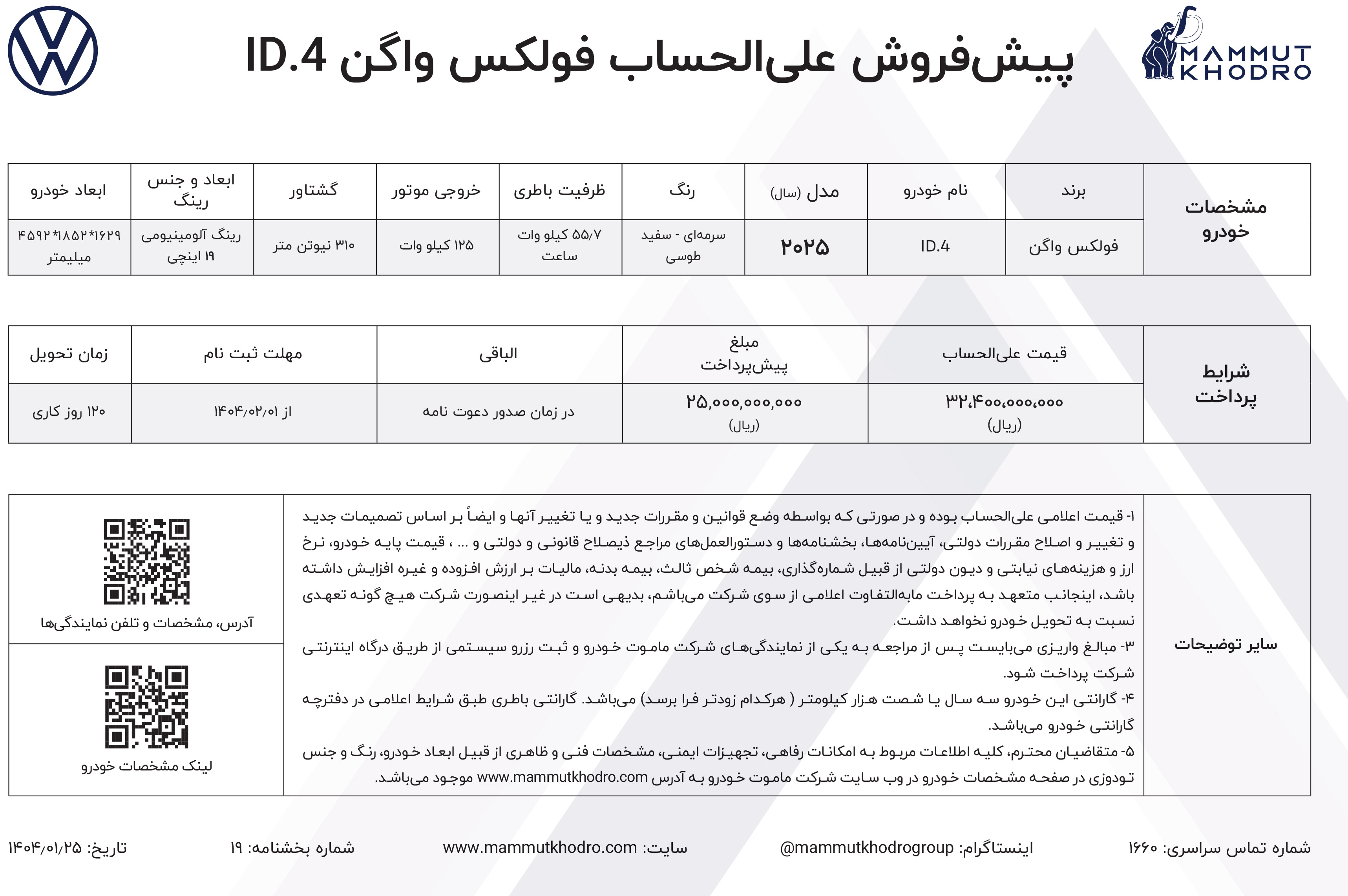 شرایط فروش ماموت خودرو ویژه متقاضیان ثبت نام فولکس ID4 برای فروردینماه 1405 اعلام شده است. در این مرحله از ثبت نام ماموت خودرو، قیمت خودروها قطعی بوده و موعد تحویل نیز فوری خواهد بود: