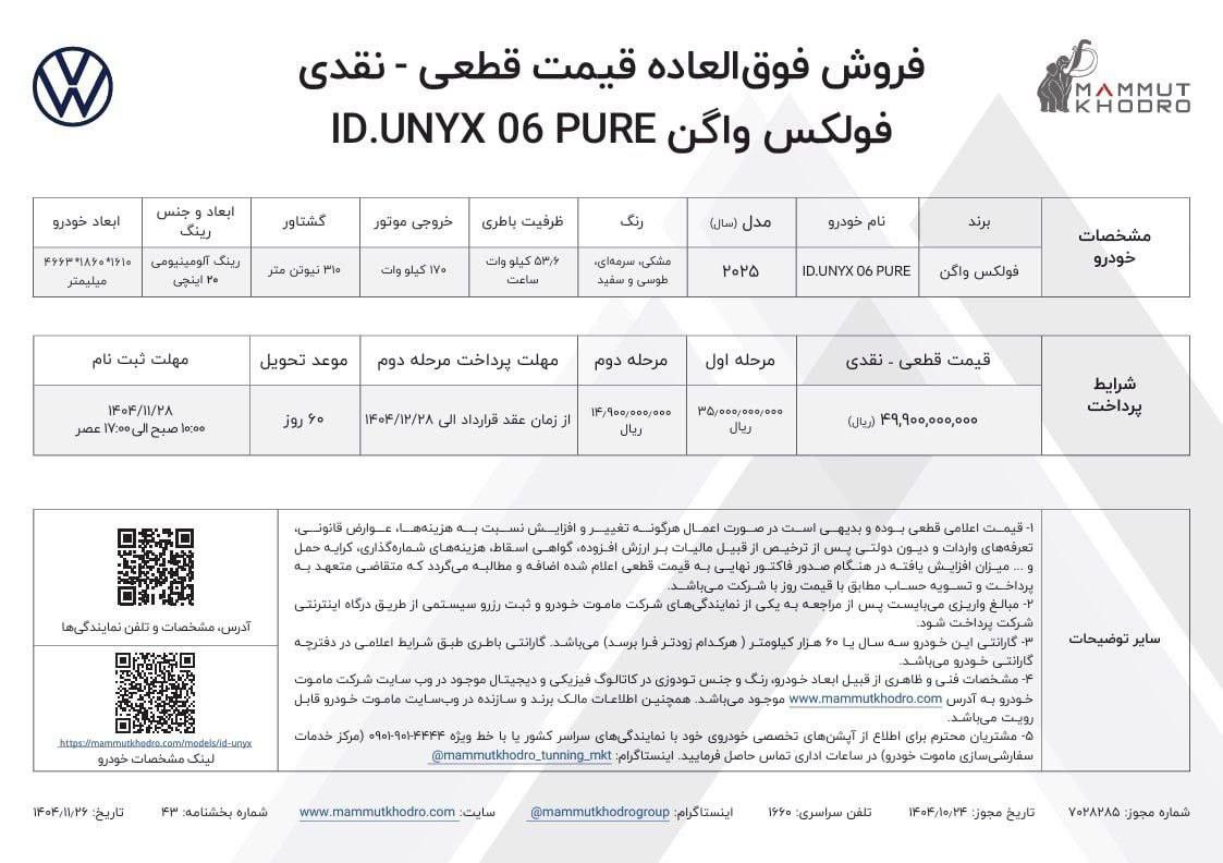 طرح فروش فوقالعاده ماموت خودرو ویژه متقاضیان ثبت نام فولکس واگن آی دی یونیکس پیور، از روز سه شنبه 1404/11/28، ساعت 10 تا 17 اجرا خواهد شد: