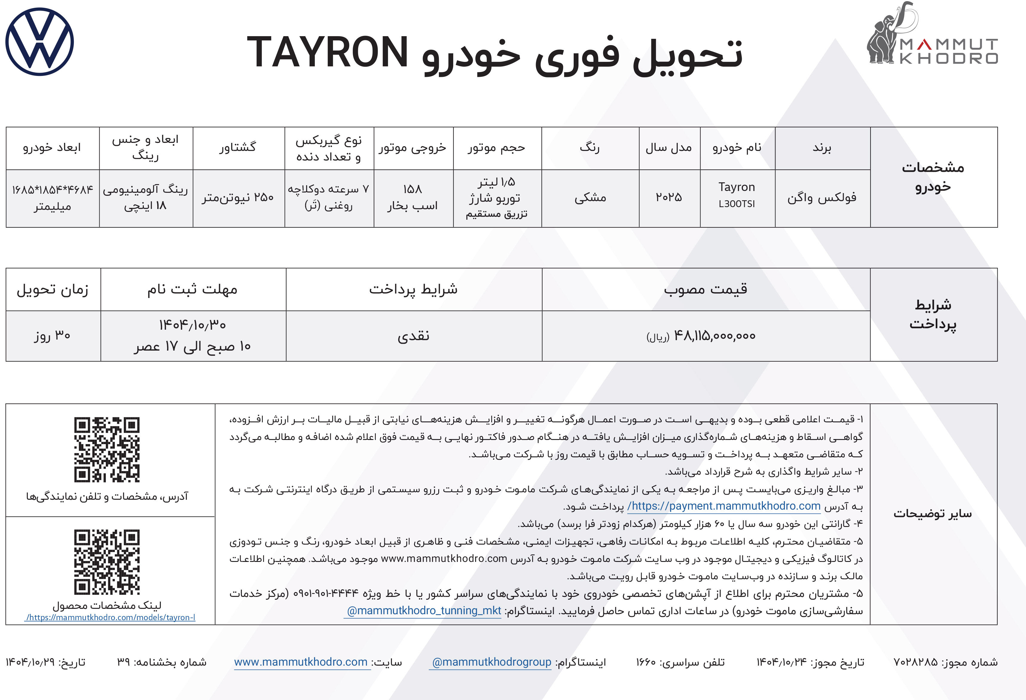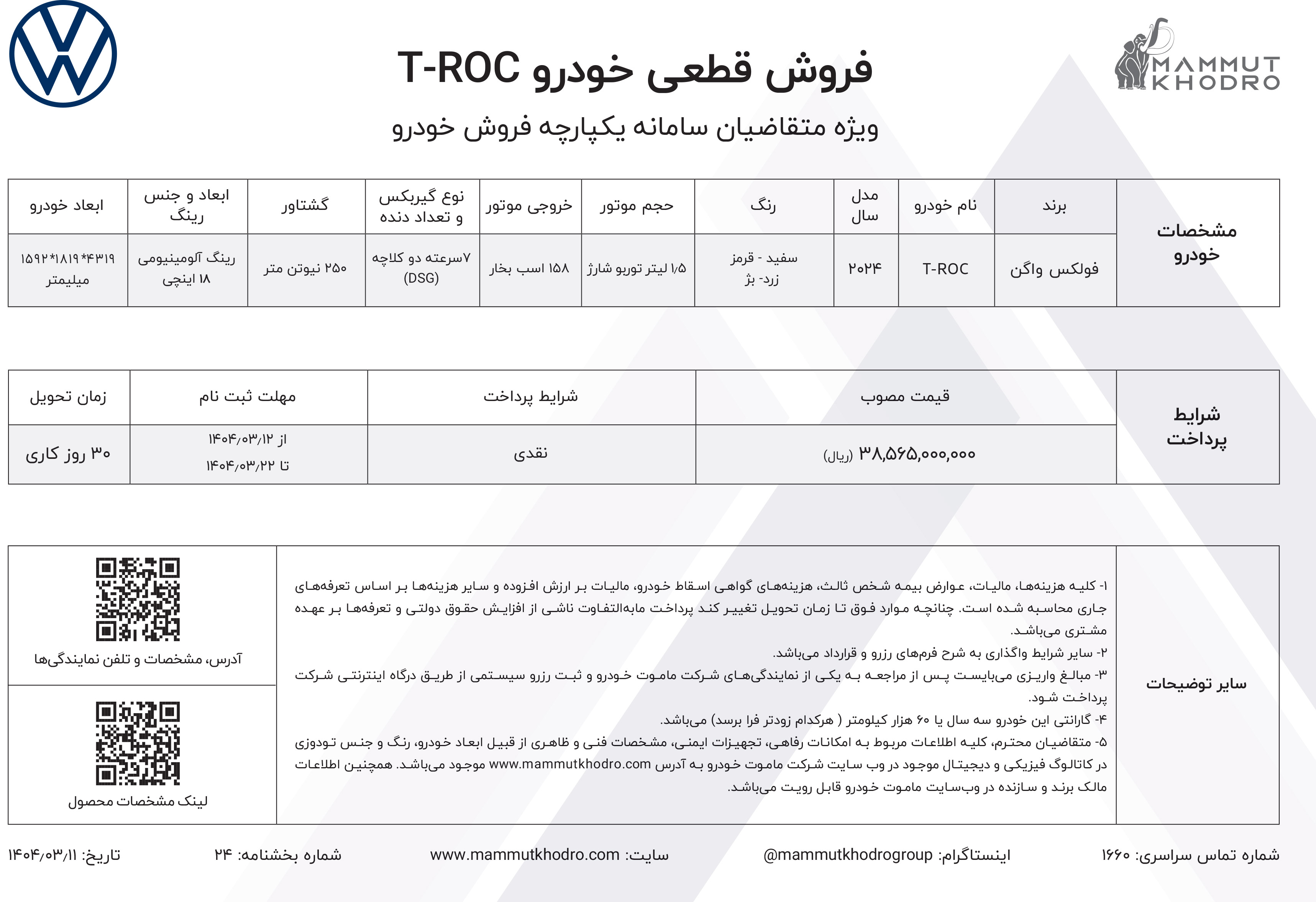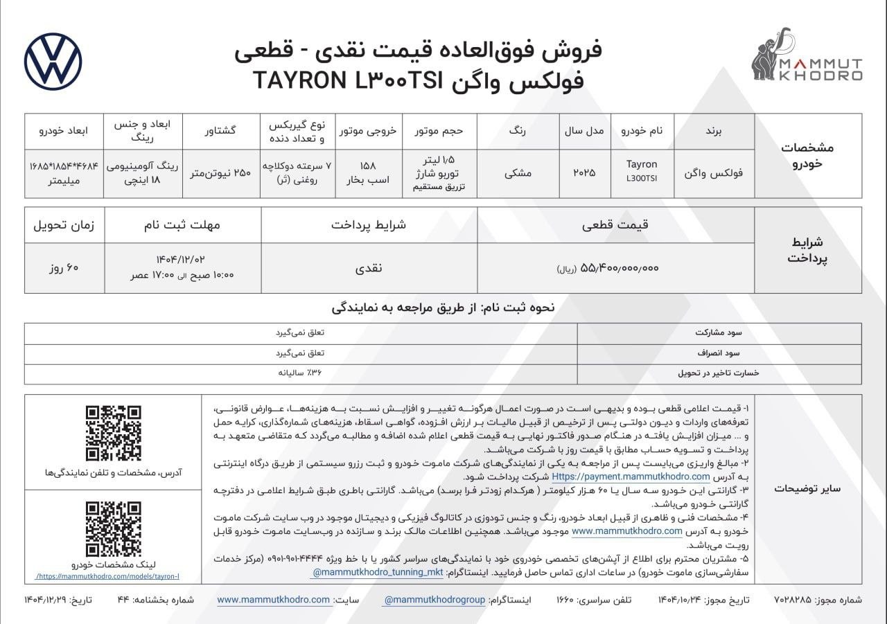 طرح پیش فروش ماموت خودرو ویژه متقاضیان ثبت نام فولکس واگن وارداتی این شرکت، از روز دوشنبه مورخ 1404/11/13 آغار شده و تا عصر همان روز یا تا زمان تکمیل ظرفیت فروش، ادامه خواهد داشت:
