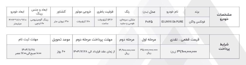 شرایط فروش ماموت خودرو ویژه متقاضیان ثبت نام خودروی برقی فولکس آیدی یونیکس، از روز شنبه مورخ 1404/09/01 آغاز شده و حداکثر تا 24 ساعت یا تا زمان تکمیل ظرفیت فروش نیز ادامه دارد: