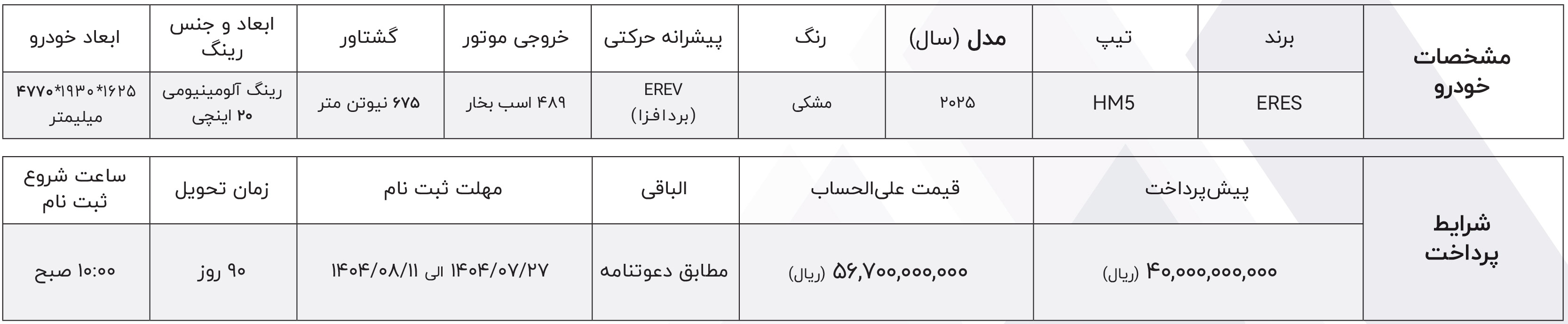پیش فروش ایرس، برای نخستینبار از سوی شرکت عرضه کننده، اعلام شده است. اولین مرحله ثبت نام ایرس ماموت خودرو، روز شنبه مورخ 1404/02/06 آغاز شده و تا زمان تکمیل ظرفیت نیز ادامه دارد: