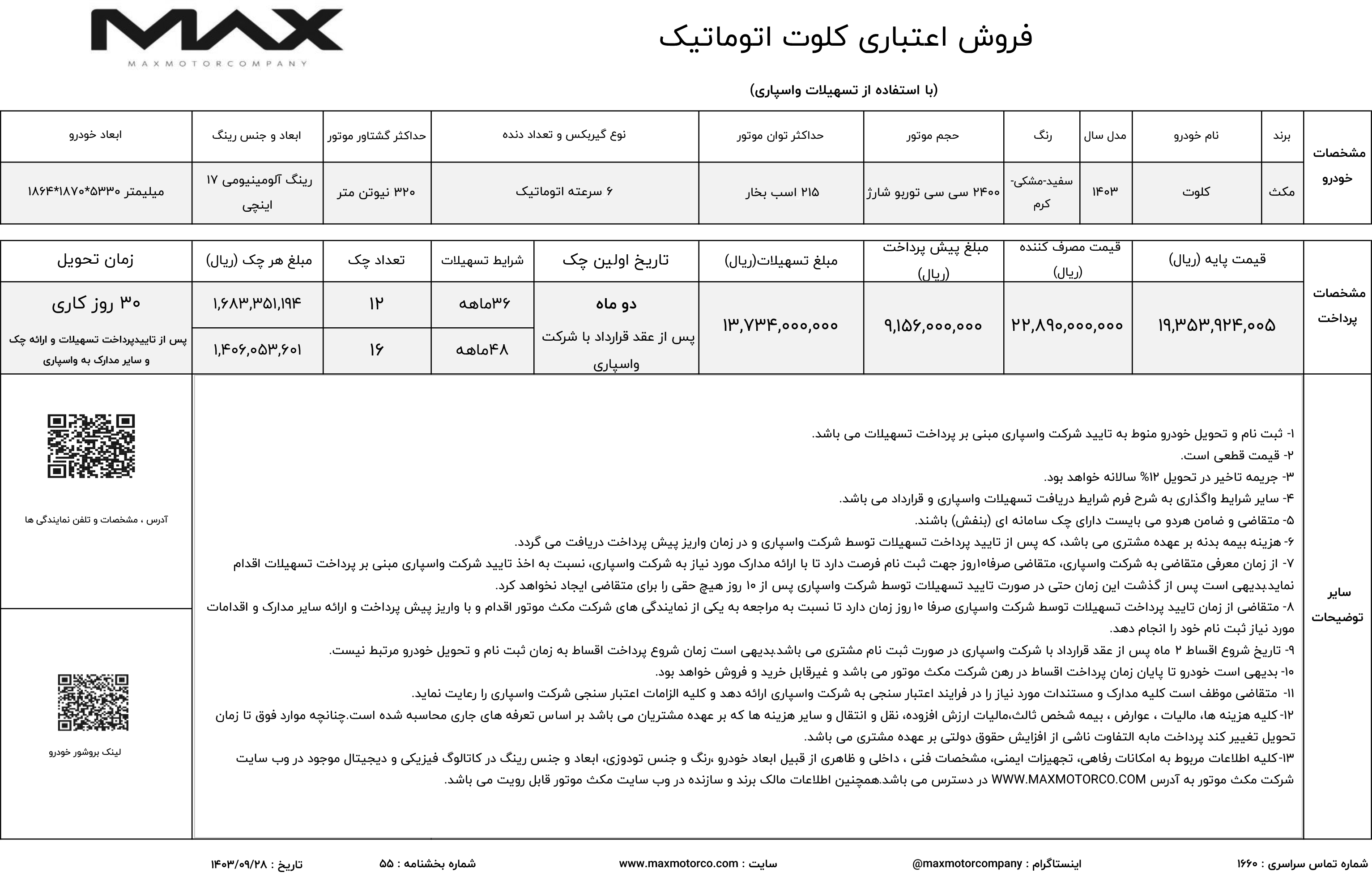 فروش اعتباری کلوت اتومات با تسهیلات واسپاری، از سوی شرکت مکث موتور آغاز شده است. در این طرح، موعد تحویل خودروها 30 روز کاری بوده اما بازپرداخت اقساط، 36 ماهه یا 48 ماهه (به انتخاب مشتری) خواهد بود: