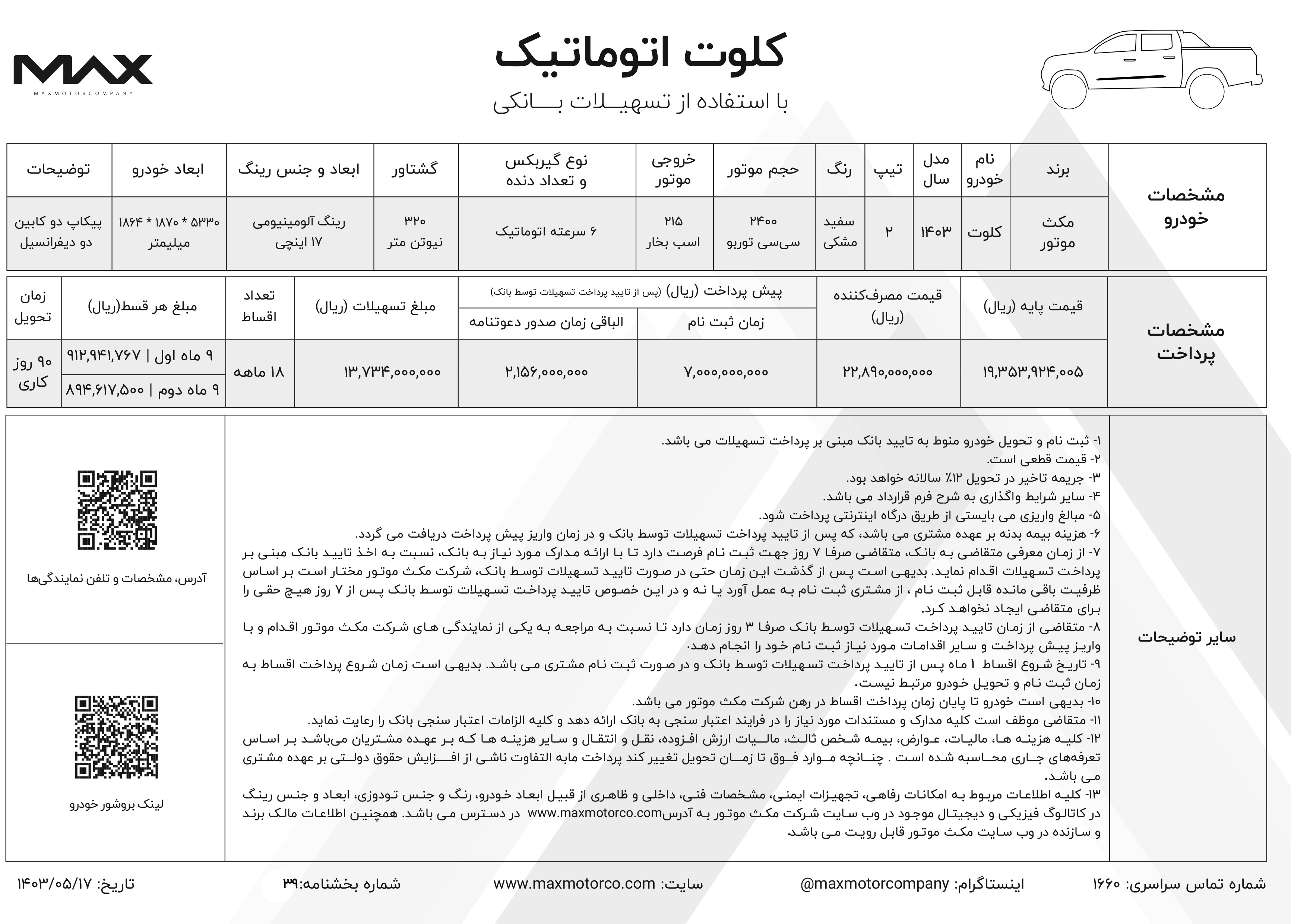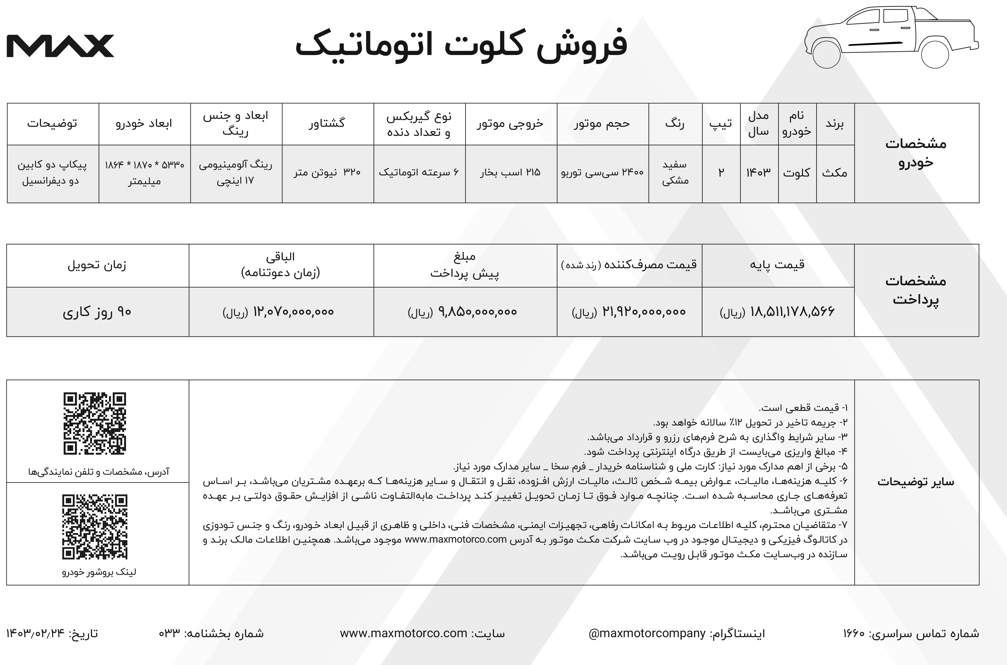 همزمان با اعلام قیمت جدید کلوت اتوماتیک، شرایط فروش کلوت نیز از سوی شرکت مکث موتور اعلام شد. ثبت نام پیکاپ کلوت اتومات، از روز چهارشنبه مورخ 1403/05/17 آغاز شده و تا زمان تکمیل ظرفیت فروش خودروها نیز ادامه خواهد داشت: