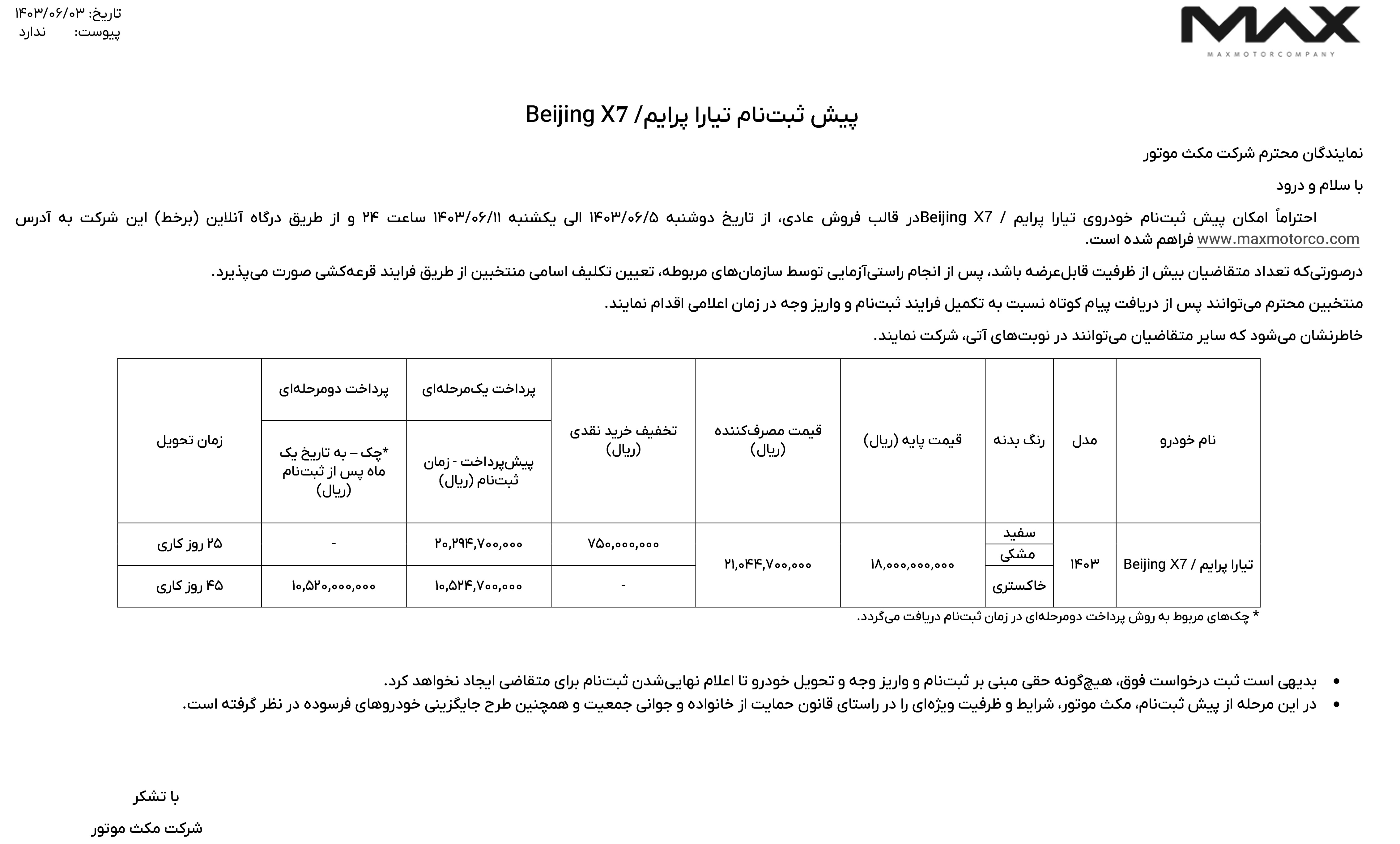 مطابق بخشنامه فروش نقدی مکث موتور، قیمت خودرو قطعی بوده و زمان تحویل نیز 90 روز کاری است. جزییات بیشتر را از لینک زیر دریافت کنید: