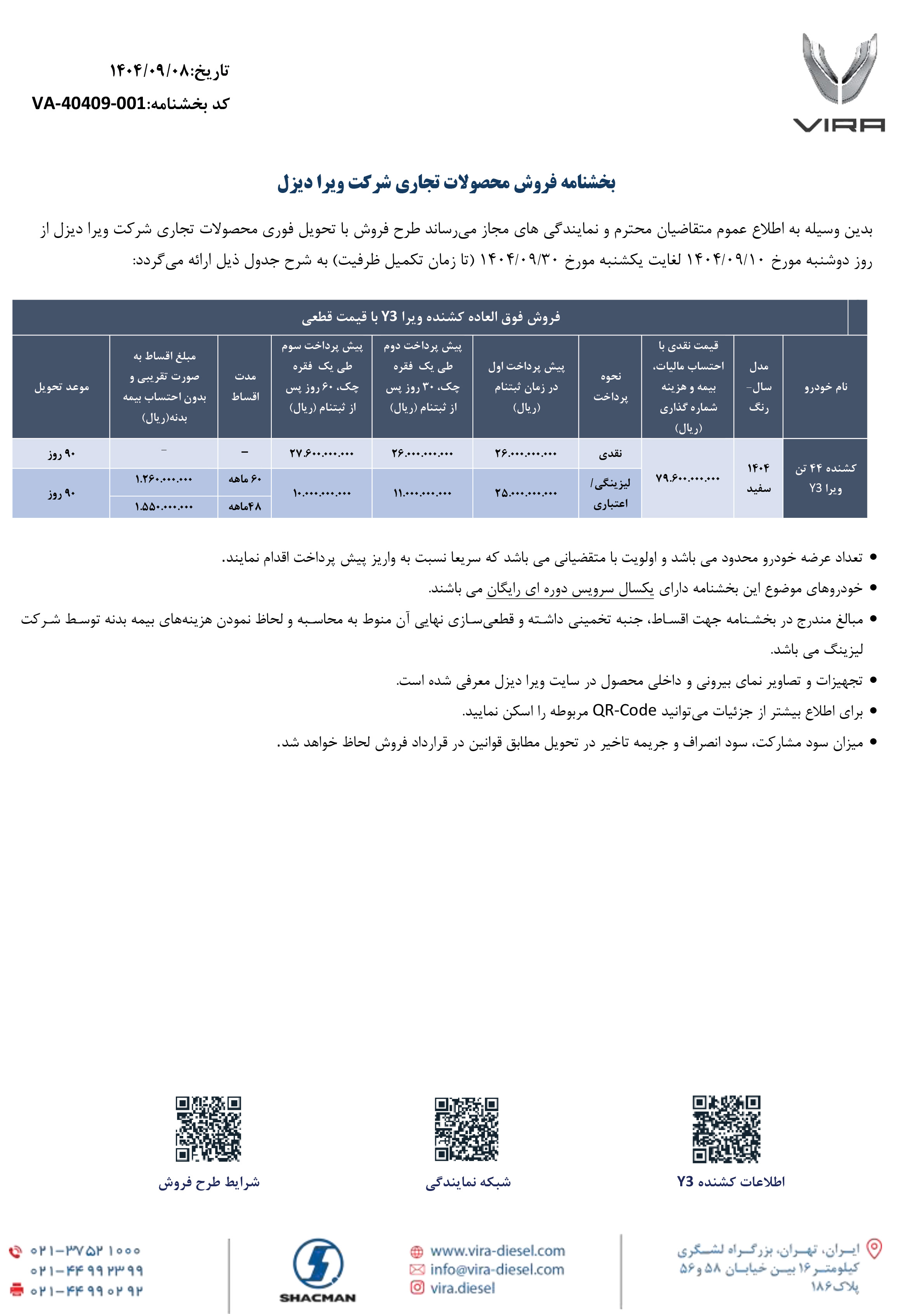 در این مرحله از فروش ویرا دیزل، کشنده شاکمان Y3 با مدل 1404 و به روش فروش فوق العاده عرضه شده اما کامیونت Y9 با مدل 1403 و به روش فروش فوری، در اختیار مشتریان قرار میگیرد. جزییات بیشتر را از لینک زیر دریافت کنید: