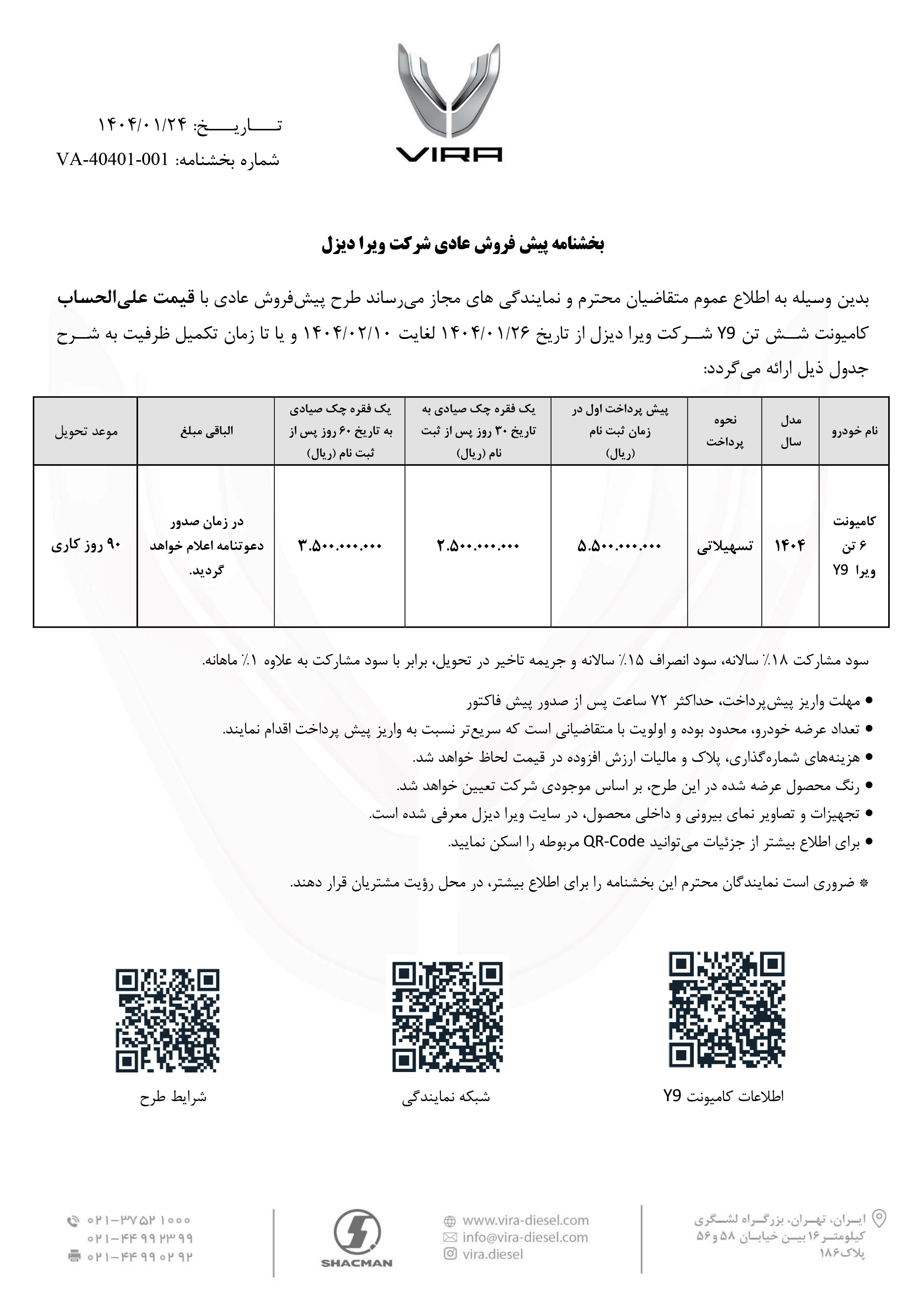 طرح فروش کامیون شاکمان، از روز دوشنبه مورخ 1403/11/01 آغاز شده و تا روز دوشنبه مورخ 1403/11/08 یا تا زمان تکمیل ظرفیت فروش ویرا دیزل، ادامه خواهد داشت: